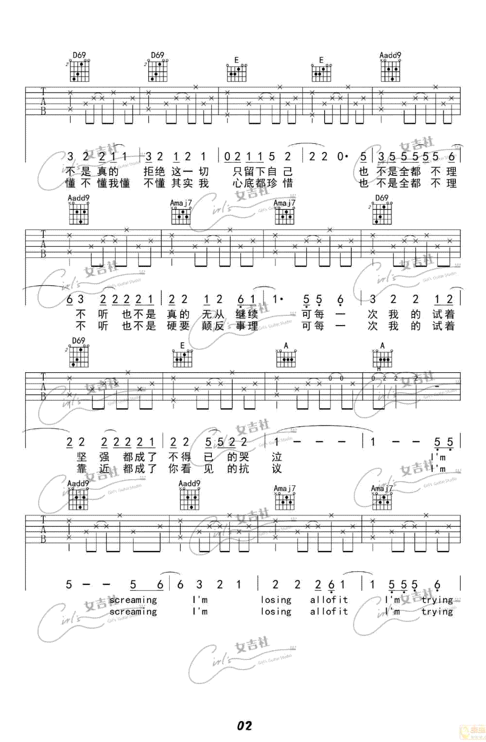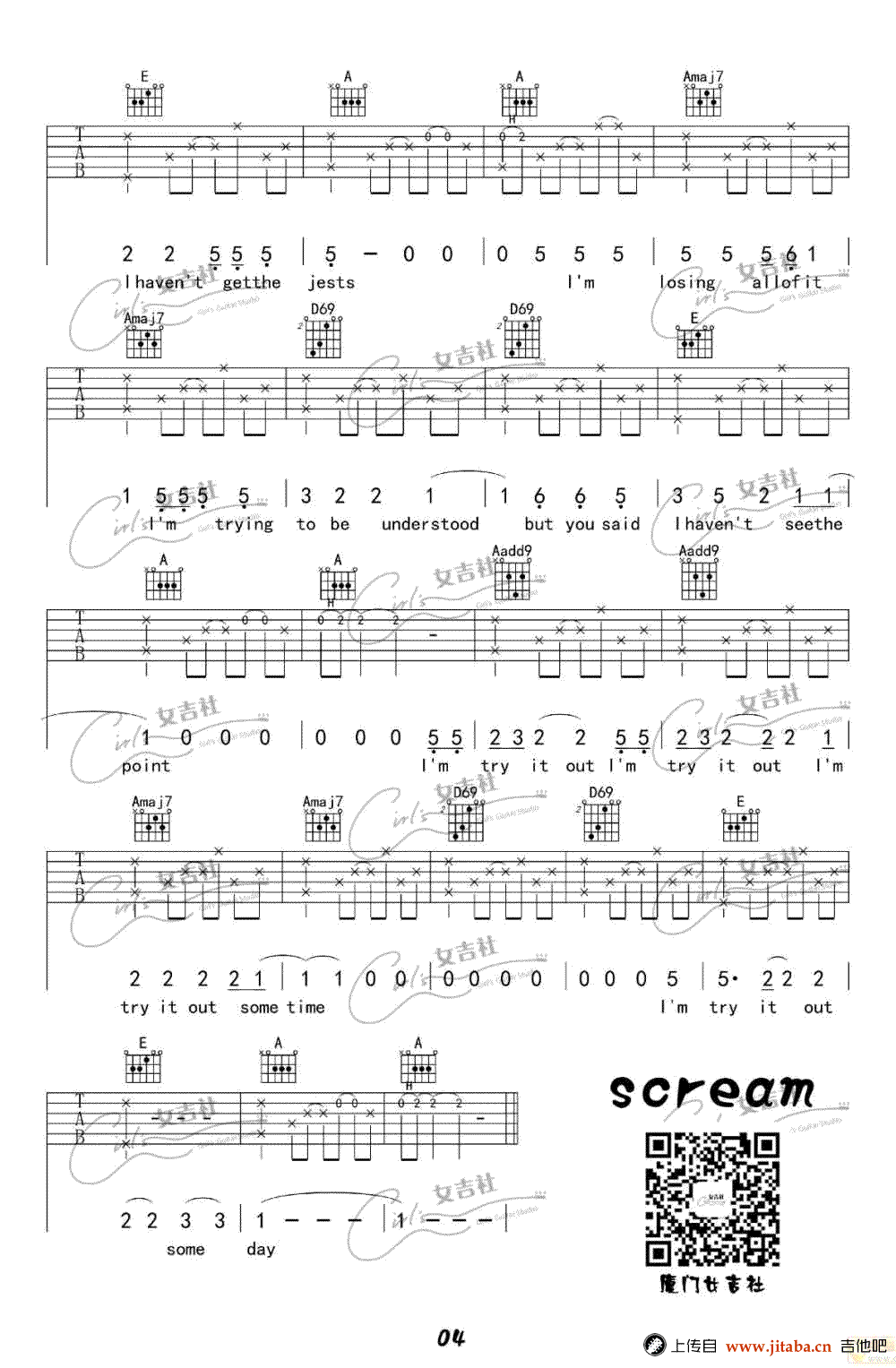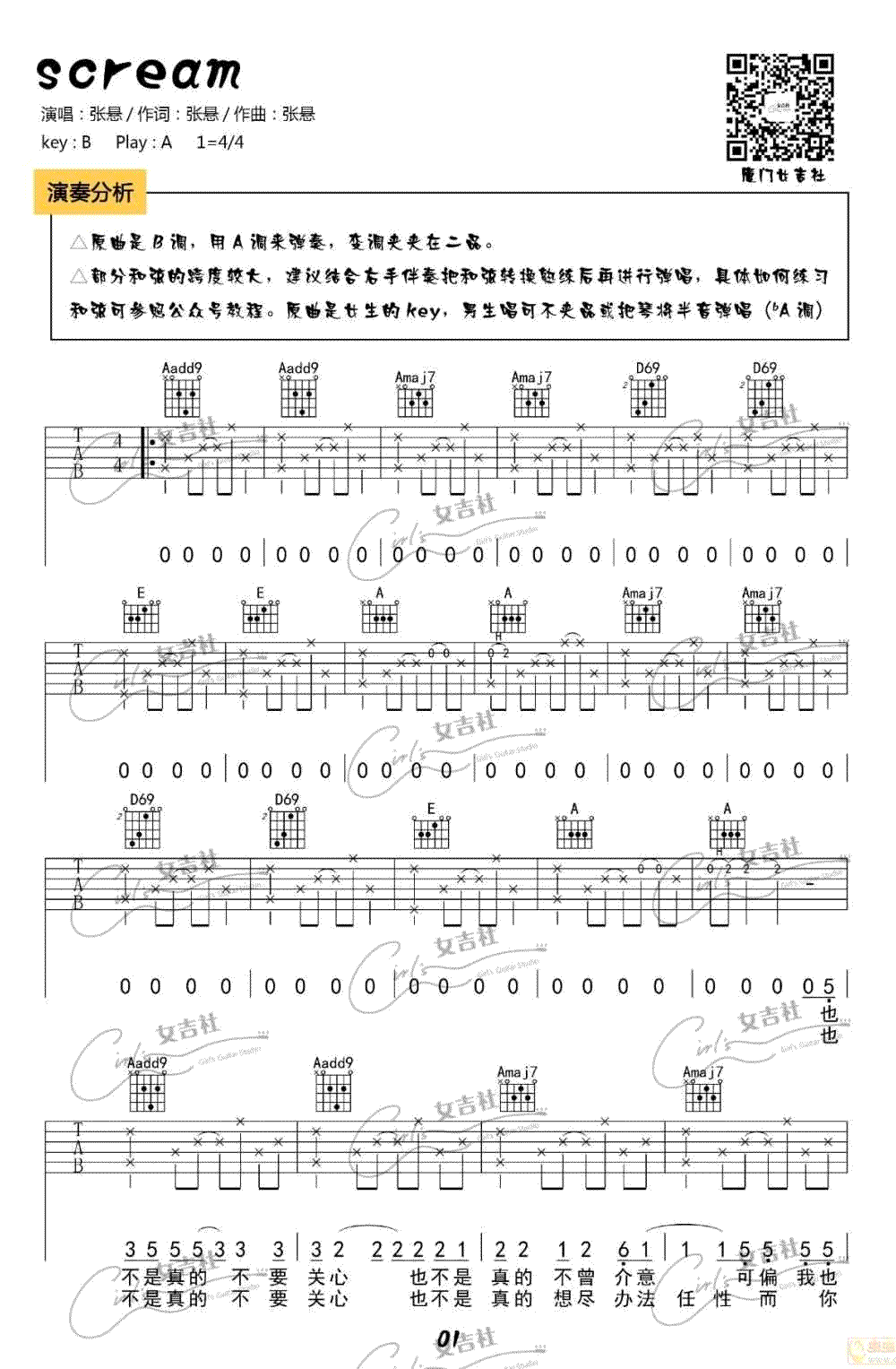曲谱介绍: scream吉他谱,张悬词曲演唱,原调B,选用A调指法弹奏,变调夹夹二品。Scream吉他六线谱,四张弹唱图片谱,女吉社编配出品。演奏提示,部分和弦的跨度较大,建议结合右手伴奏把和弦转换熟练后再进行弹唱。原曲是女生调,男生可不夹品或降半音调弦弹唱bA调。随谱附上吉他弹唱和教学视频: