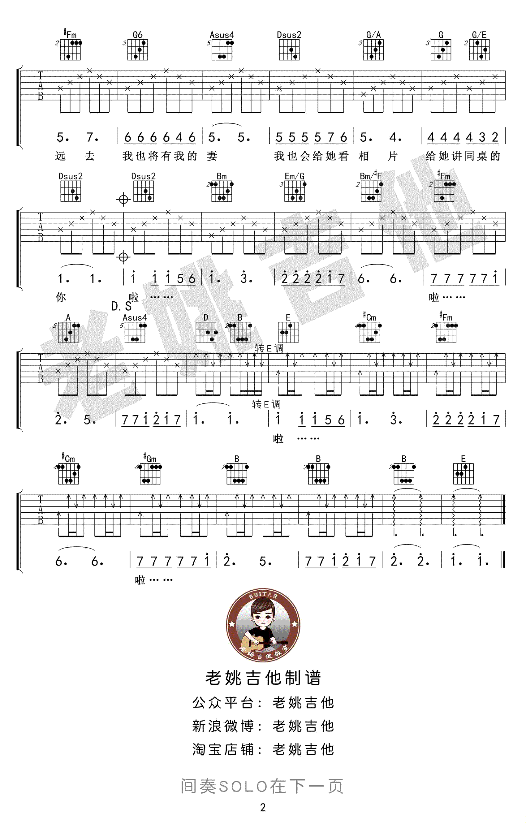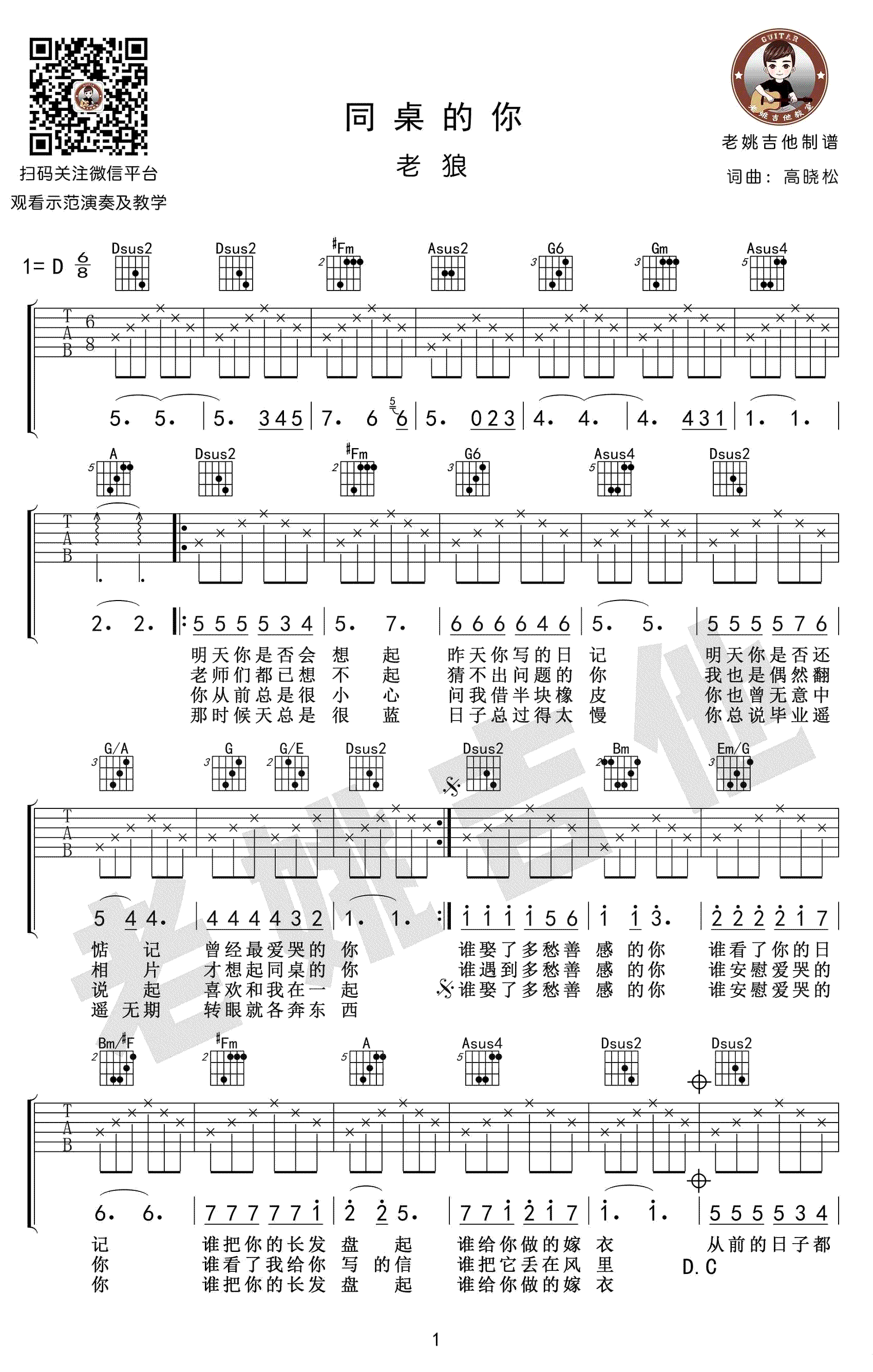 曲谱介绍: 同桌的你吉他谱,老狼调一首经典校园民谣歌曲,D调高清弹唱谱,同桌的你六线谱,带间奏Solo,老姚吉他编配出品,91吉他谱网站推荐分享。又是一年毕业季,感怀与伤感齐来,学生时代的日子总是让人怀念。还记得当年,坐在你前后左右的同学吗?还记得当年你暗恋过的女孩吗?青葱岁月转瞬即逝,挥挥手告别从前,怎还忍去怀念,一首老歌带给你。 《同桌的你》吉他弹唱教学