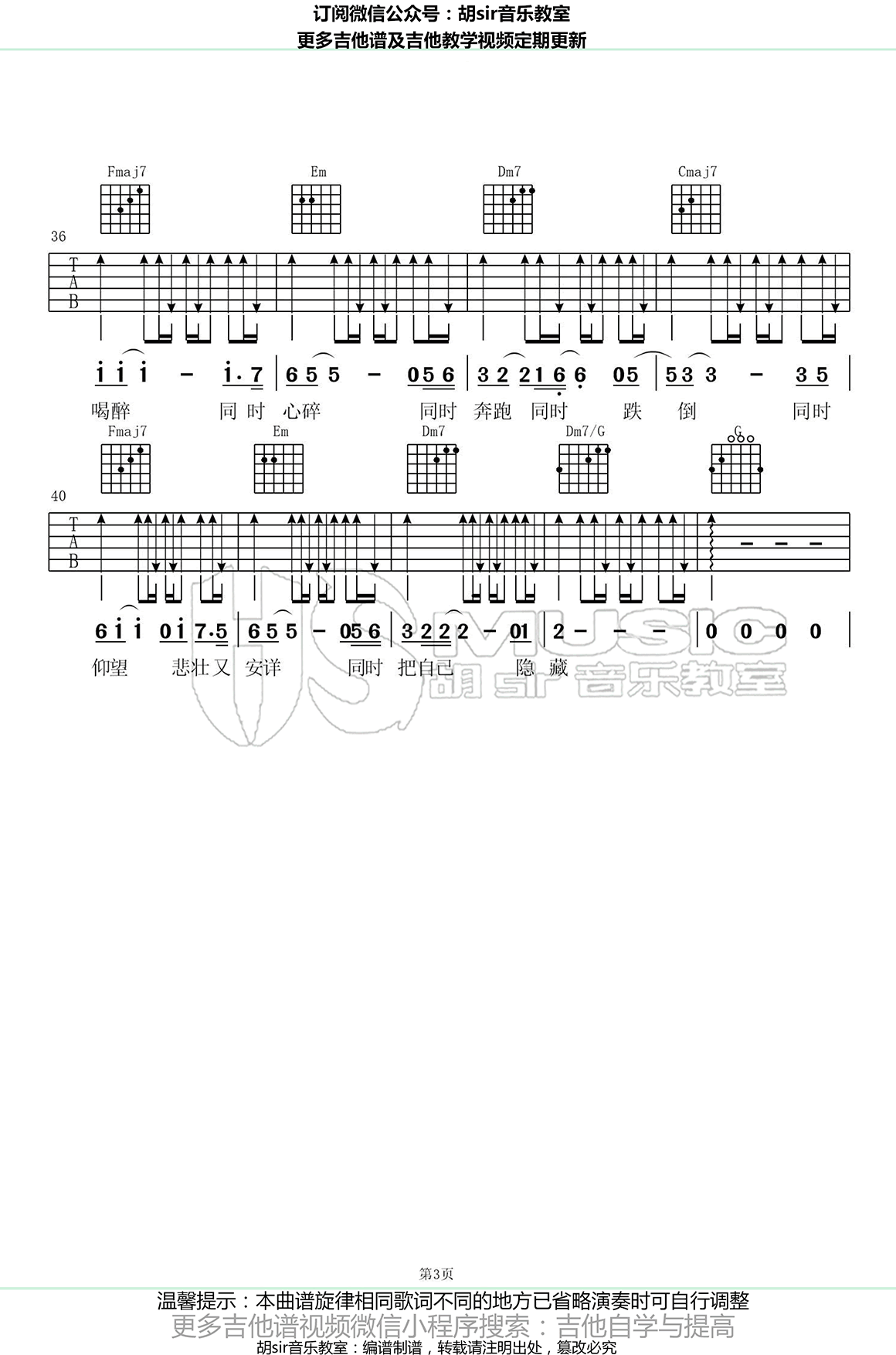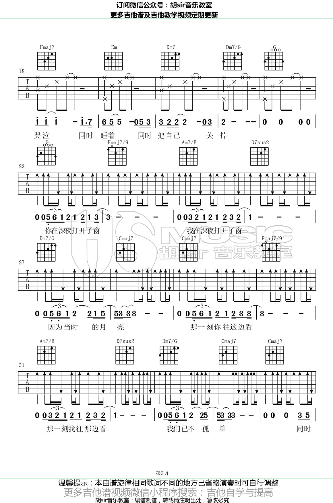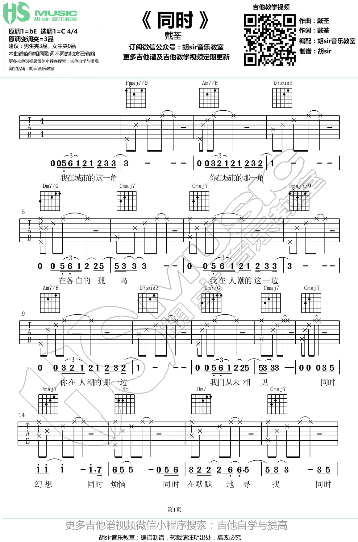 曲谱介绍: 戴荃《同时》吉他谱,原调bE,选调C,原调变调夹夹第三品,戴荃的一首暖心单曲,同时吉他弹唱谱,三张图片六线谱,胡Sir音乐教室编配出品,91吉他谱推荐分享。 18年戴荃首波城市概念单曲《同时》,一首有温度的歌曲,安静中透着无奈,无奈中流露出坚强。唱给所有在实现自己梦想的人。每个拼搏在当下的人都不孤单,每一刻都有人在城市的别处,与你做着同样的事。