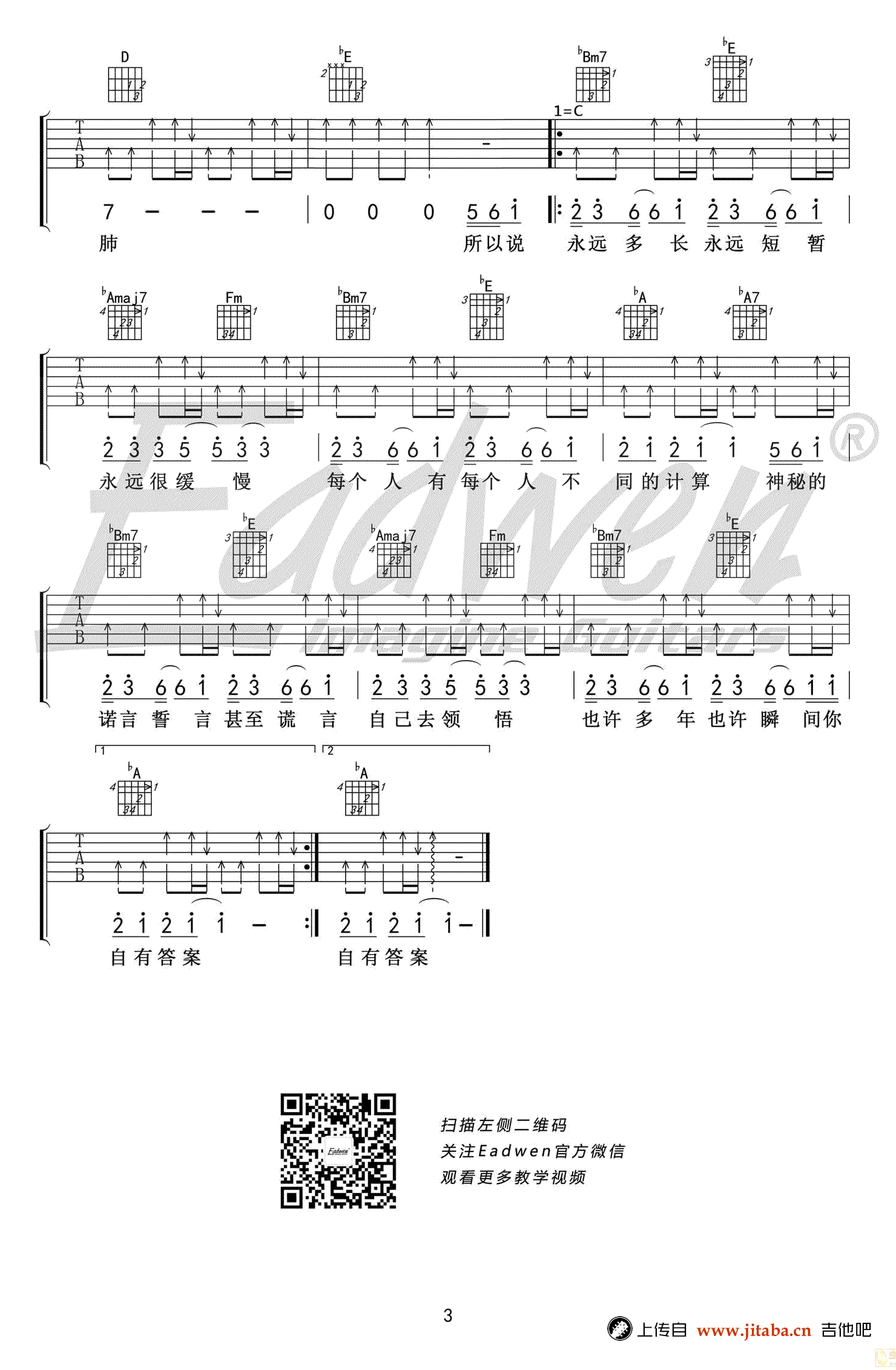 曲谱介绍: 热门抖音歌曲《答案》吉他谱,杨坤郭采洁演唱,选调G转bB转bA,变调夹夹四品,答案六线谱,原版编配,高清图片谱,感谢爱德文吉他教室出品。随谱附上陈佰老师带来的吉他弹唱教学视频,琴友们参照配套曲谱跟随讲解示范学习。 整首歌曲前部分非常简单,后半部分有很大难度,要考验大家的演奏水平和能力了。