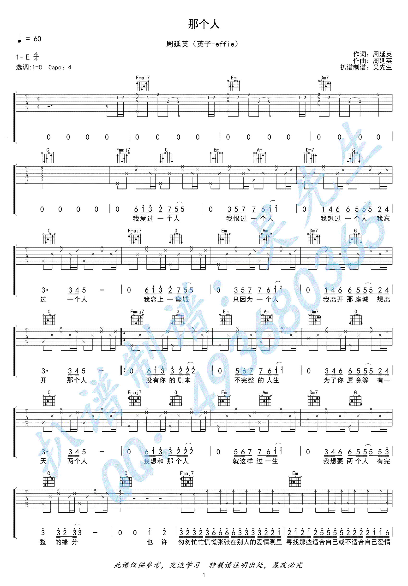 曲谱介绍: 周延英《那个人》吉他谱,原调E,选调C,Capo夹四品。那个人吉他弹唱谱,高清弹唱图片谱,感谢吴先生编配,91吉他谱网站上传分享。