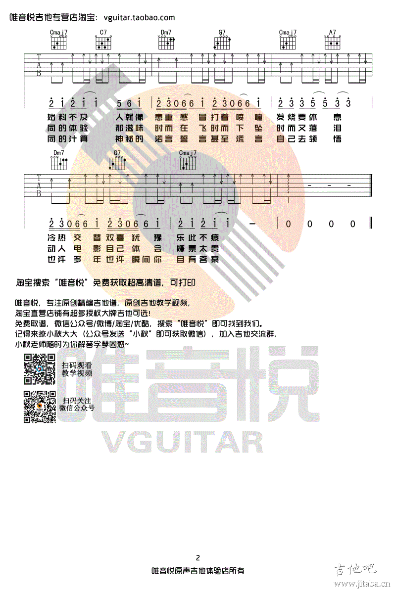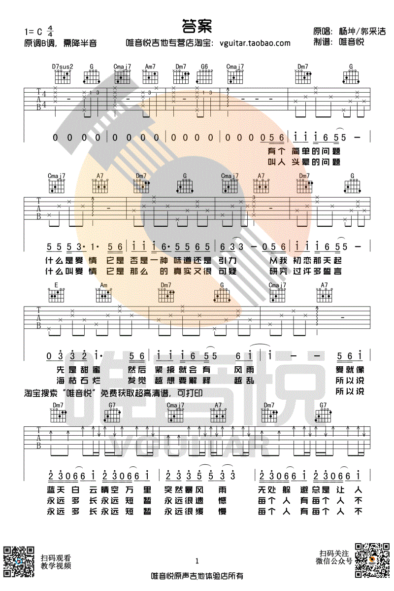 曲谱介绍: 杨坤郭采洁《答案》吉他谱,C调超简单版,原调B调,需降半音,抖音神曲《答案》吉他弹唱谱,唯音悦编配出品。 这首歌和弦这首歌几乎就4个和弦循环《Dm7-G-Cmaj7-A7》这四个和弦基本可以走完整首歌,男生部分是Dm7-G-E-Am-Dm7-G-Cmaj7-A7。前奏的谱子也给大家发一下,非常非常简单的一首歌~~好听又简单,大家赶紧get呗~