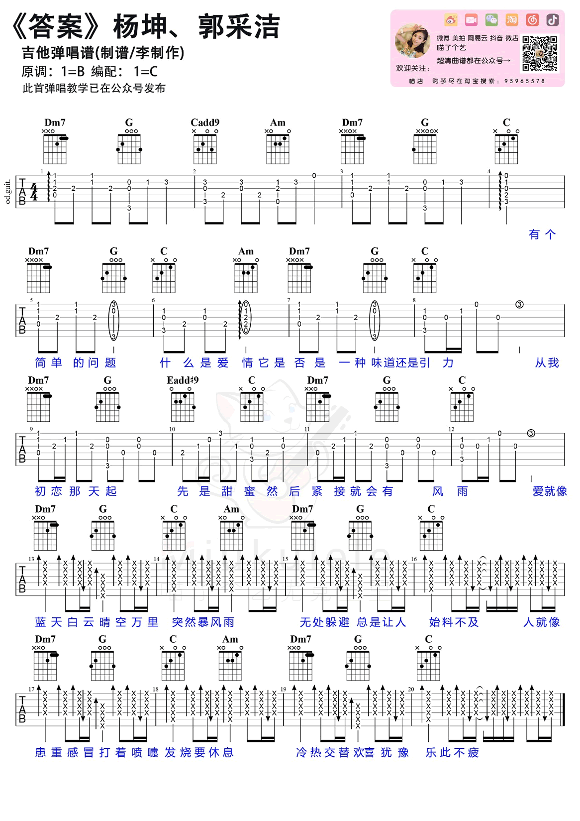 曲谱介绍: 杨坤郭采洁《答案》吉他谱,原调B,选调C,一首热门抖音歌曲,答案吉他六线谱,前奏到副歌部分简单版本,感谢喵了个艺编配出品,91吉他谱上传。喜欢这首歌曲的琴友们跟随李老师的吉他弹唱教学视频练习起来。爱情的主题如同晴雨表一,让人琢磨不定。杨坤和郭采洁合唱的这首歌曲,给出了爱情一个适合的《答案》。