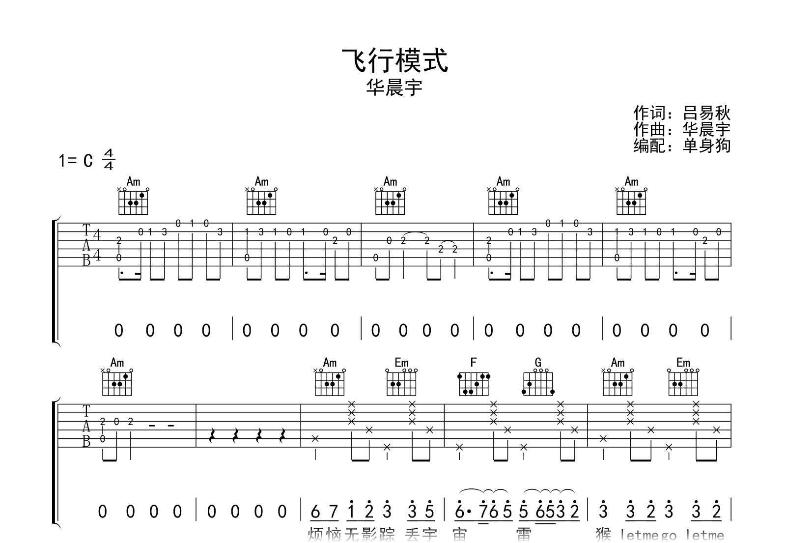 飞行模式吉他谱 - 华晨宇 - C调吉他弹唱谱