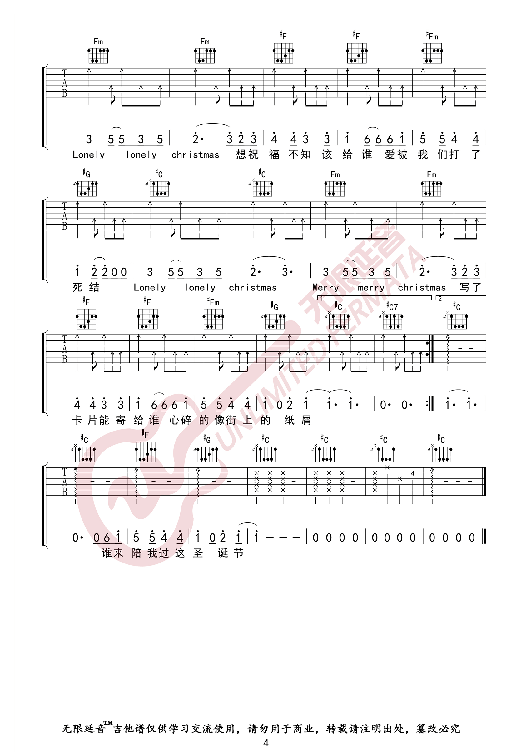 曲谱介绍: 吉他谱介绍:圣诞结吉他谱,陈奕迅演唱的一首歌曲,6/8拍的节奏,这首歌曲的原调为C调,这里曲谱采用了C调指法进行编配,演唱时可不夹变调夹,曲谱由琴谱网更新上传,共4张高清图片弹唱吉他谱例,来源于@无限延音编配出品。圣诞节是可能是一个很幸福的节日吧,但是也有可能是失落。陈奕迅的声音很温柔,副歌部分的英文让人觉得眼前一亮,很特别。希望平安夜你能收到苹果,圣诞节有人陪着,听着陈奕迅的歌。