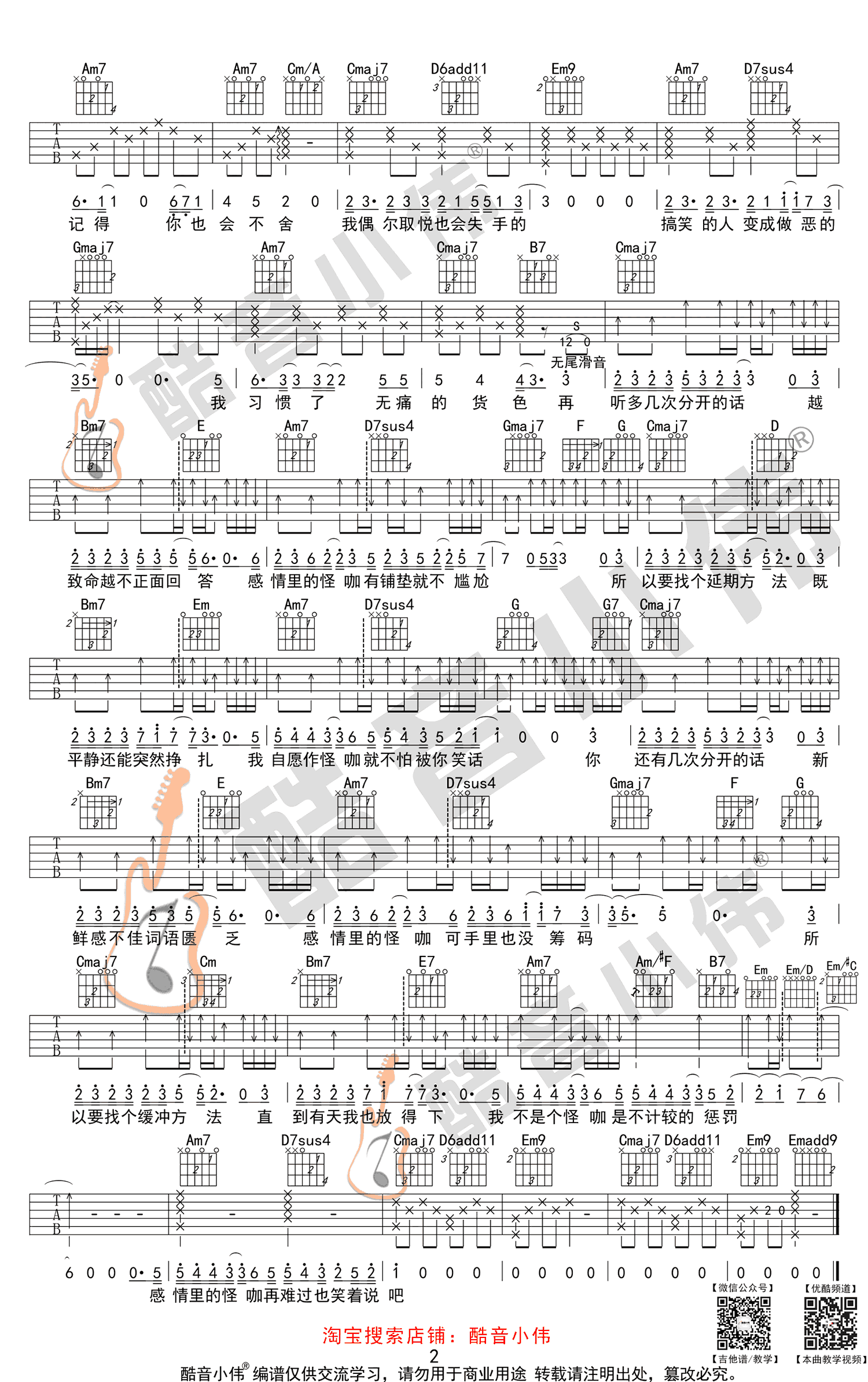 曲谱介绍: 薛之谦《怪咖》吉他谱,G调中级版,原调bB,,变调夹推荐,男生0-3品,女生3-6品。在综艺节目《无限歌谣季》中,薛之谦与杨迪合唱的一首原创歌曲,怪咖六线谱,酷音小伟编配出品,91吉他谱网站上传分享。随谱附上配套吉他弹唱教学视频,琴友们跟随小伟老师的示范讲解练习起来吧。一首深情演绎的歌曲,娓娓唱出情感世界里的怪咖,人前嬉笑人后垂泪的哀伤故事。 吉他弹唱演示及视频教学