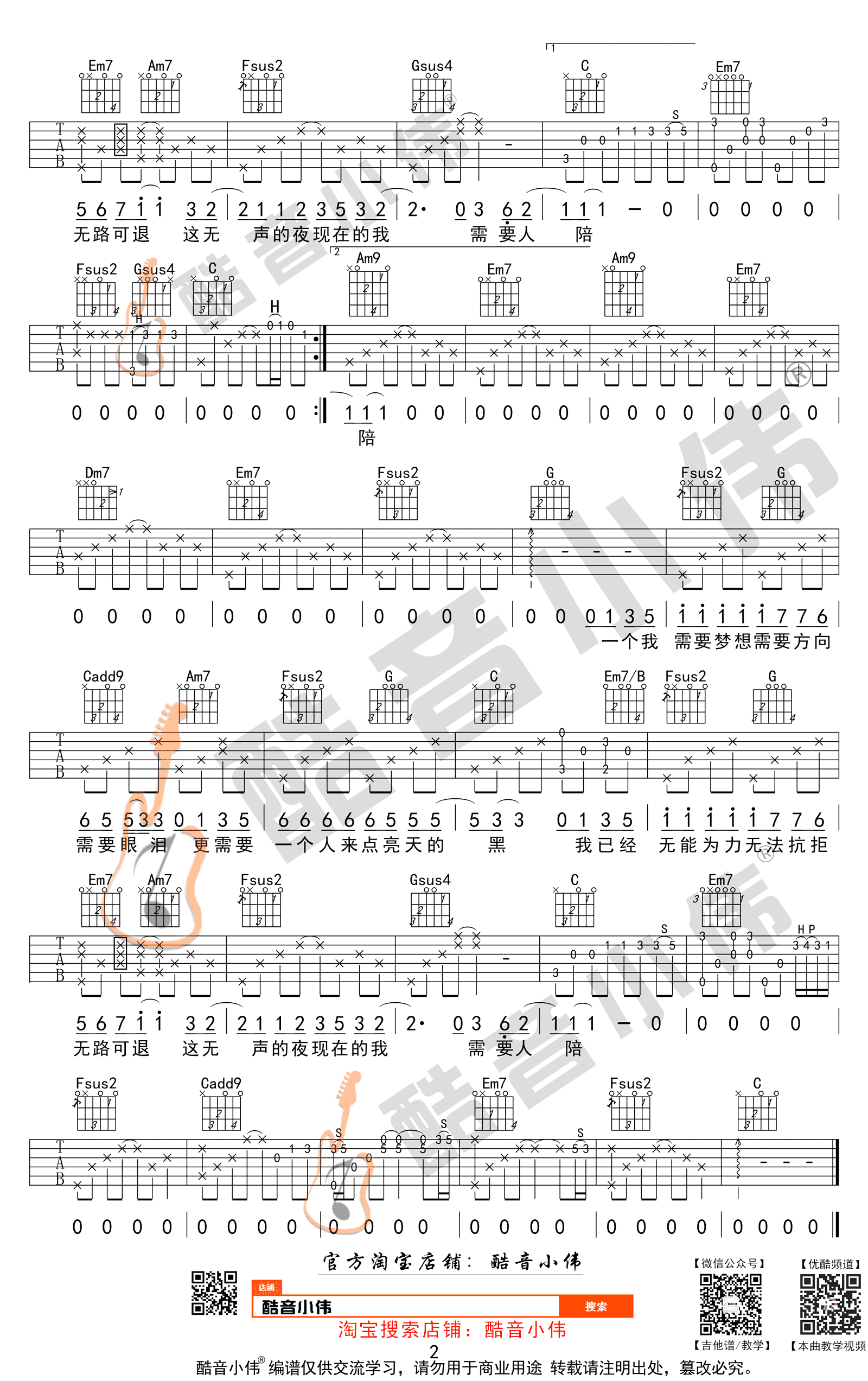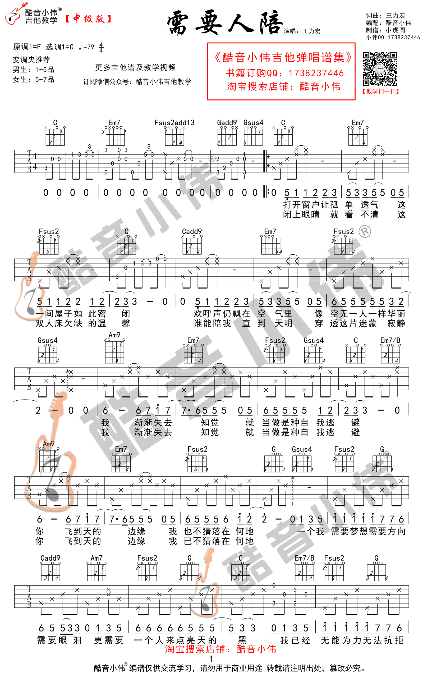 曲谱介绍: 王力宏《需要人陪》吉他谱,原调F,选调C,中级版编配,变调夹男生1-5品,女生5-7品,酷音出品,配套吉他弹唱演示和教学随谱附上,91吉他谱网站上传推荐。王力宏献唱电影《西虹市首富》插曲,让这首经典重新萦绕我们的心间。世上有着数不清的坎坷和困难,你也会有寂寞万分的时候,再苦再累,也要坚持下去,总会有一个人穿越人海来拥抱你。 《需要人陪》弹唱演示及视频教学
