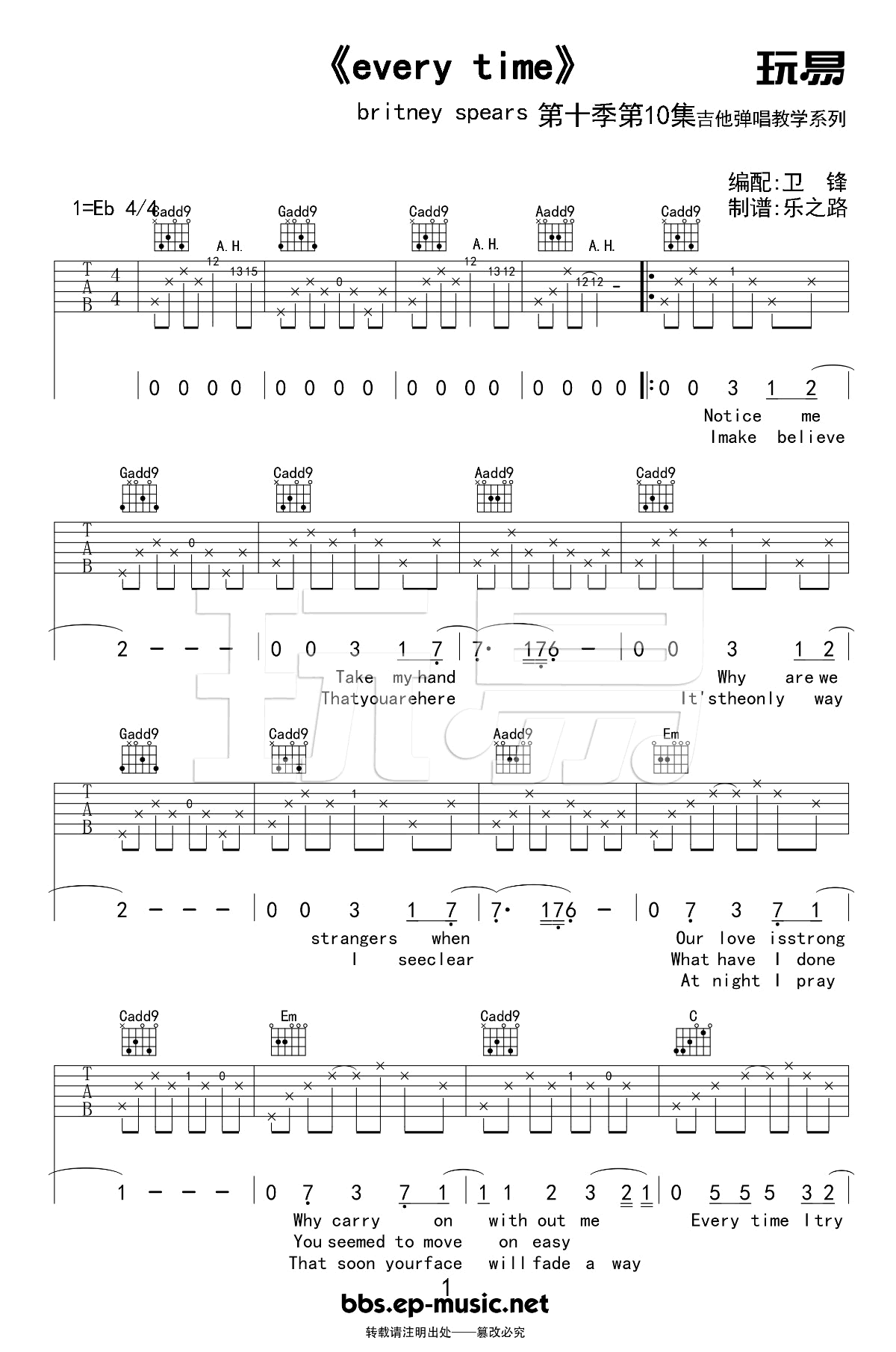 曲谱介绍: Every time 吉他谱,这是布兰妮Britney自己写的歌曲,清澈动听、宁静空灵,这首歌是她和贾斯汀分手后自己写给他的,每一句歌声每一段歌词都是最虐心的记忆,是非常经典的一首英文歌。《Every time》吉他六线谱,高清图片谱,玩易吉他出品,感谢卫峰老师编配并和胡雪沁带来吉他弹唱和教学视频。91吉他谱网站为喜欢英文歌曲的琴友推荐分享。 《Every time》弹唱演示及视频教学