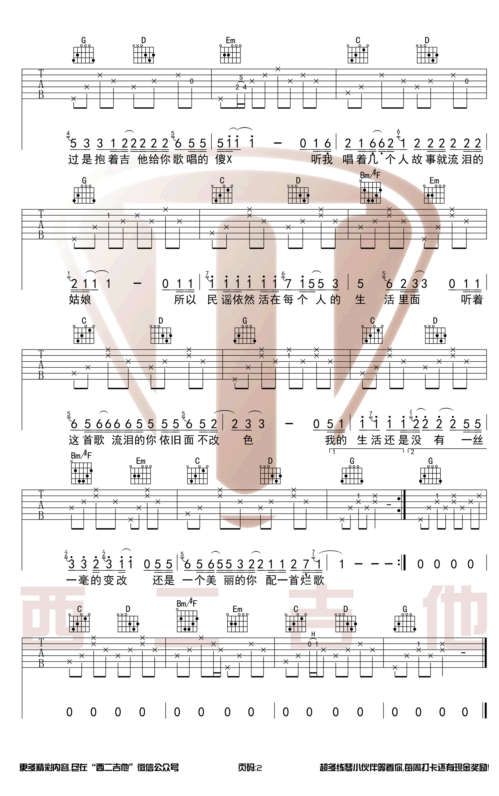 曲谱介绍: 《我们的世界很民谣》吉他谱,赵明演唱,原调B,选调G,变调夹夹第四品,我们的世界很民谣六线谱,高清版图片谱,原版伴奏编配,西二吉他出品。 民谣带给我什么?故事,自由,宁静。虽然这个世界不完美,但我们仍可以治愈自己。我们的世界很民谣还是陈小姐的话?旋律来自留声玩具的原创歌曲《十二》。