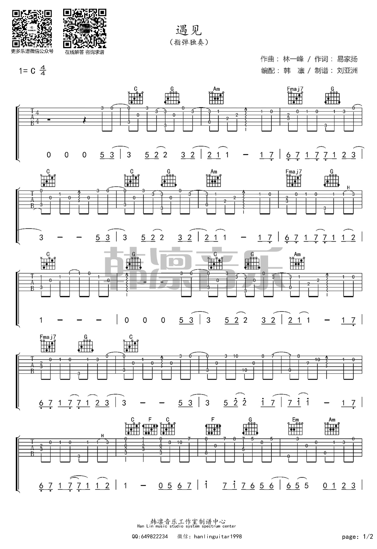 曲谱介绍: 遇见指弹谱,孙燕姿演唱的歌曲改编,电影《向左走向右走》主题曲,遇见吉他指弹谱,感谢韩凛音乐出品,91吉他谱网站上传分享。随谱附上老师带来的《遇见》吉他指弹视频,琴友们参照练习。简单的吉他谱写了最优美的旋律,略带些许伤感,但又透露出坚强,勾起你我感情回忆,让人沉浸在爱情的怅惘意境中。 吉他指弹演奏频教学
