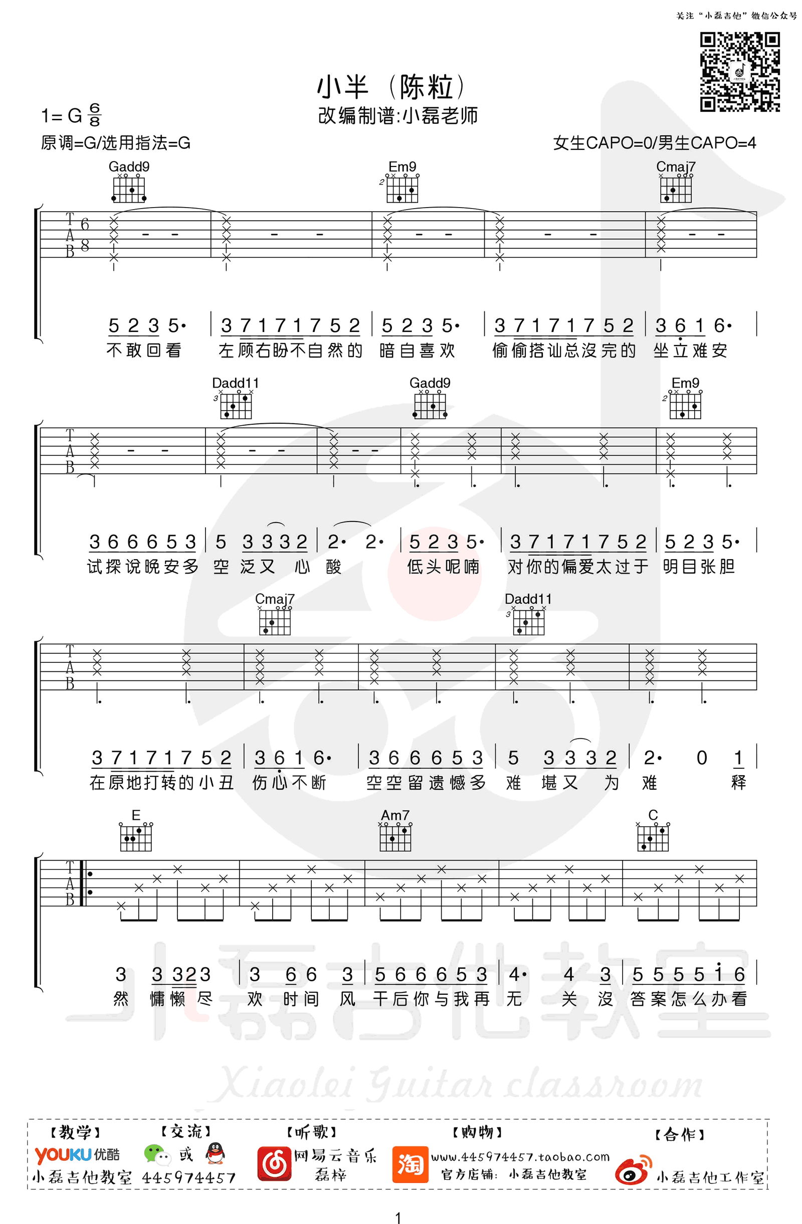 曲谱介绍: 《小半》吉他谱,G调指法弹唱谱,陈粒的一首民谣创作代表歌曲,小半六线谱,四张高清图片谱,感谢小磊吉他编配出品,91吉他谱网站推荐分享。本次教学我们讲解一首陈粒的《小半》,这是一首6/8的歌曲,这首歌的和弦都比较简单,并且变化也非常有规律,后段的6/8拍扫弦比较不常见,大家对这个扫弦方式不是很熟练的同学需要练习一下!前段的分解没有什么难度,各位同学要结合原版的唱调和歌词铿锵有力的唱法,仔细学习一下哦! 难度:5级 《小半》吉他弹唱演示及教学视频