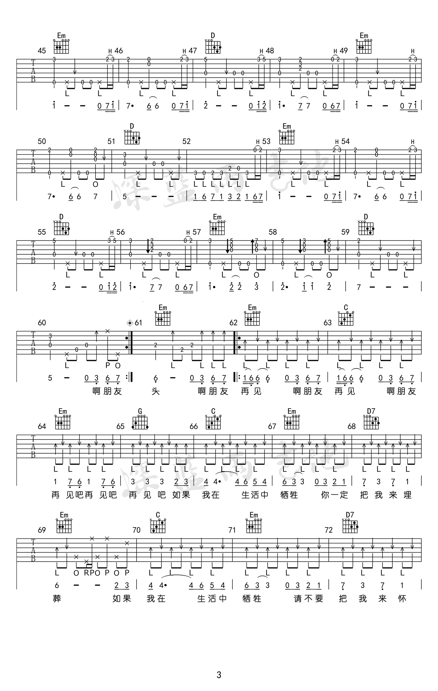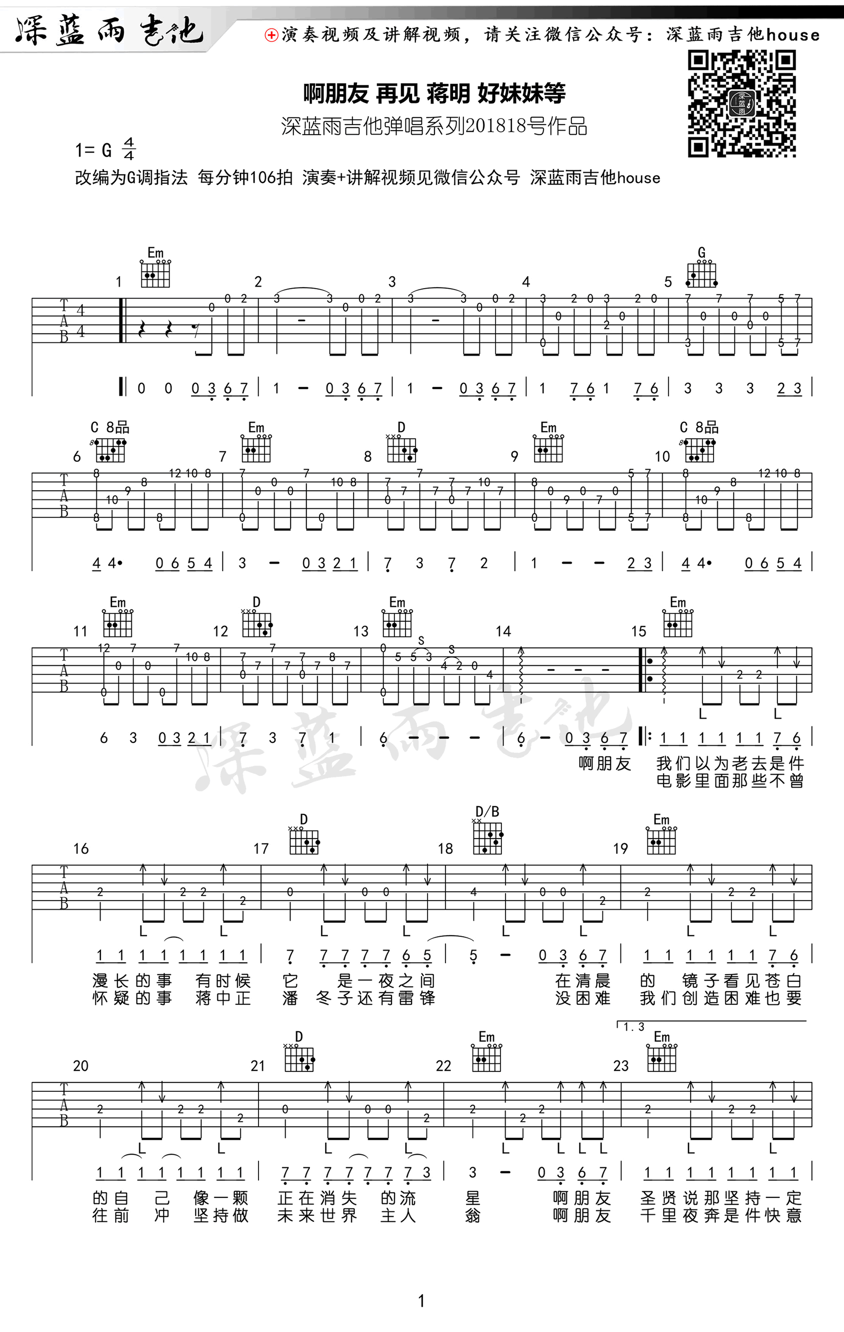 曲谱介绍: 蒋明《啊朋友再见》吉他谱,G调指法编配,民谣歌手蒋明用改编经典的方式,致敬经典,很好听有味道的一首民谣歌曲,蒋明/冬子/刘东明/好妹妹乐队/钟立风/小河众民谣歌手合唱,啊朋友再见六线谱,四张弹唱图片谱,感谢深蓝雨吉他出品,并带来曲谱配套的吉他弹唱教学视频。在我们长长一生里,要遇到很多人;最后又会和很多人道再见。但是那些美好,那些淡淡惆怅的记忆,会永远驻留在我们心里。 《啊朋友再见》吉他视频教学