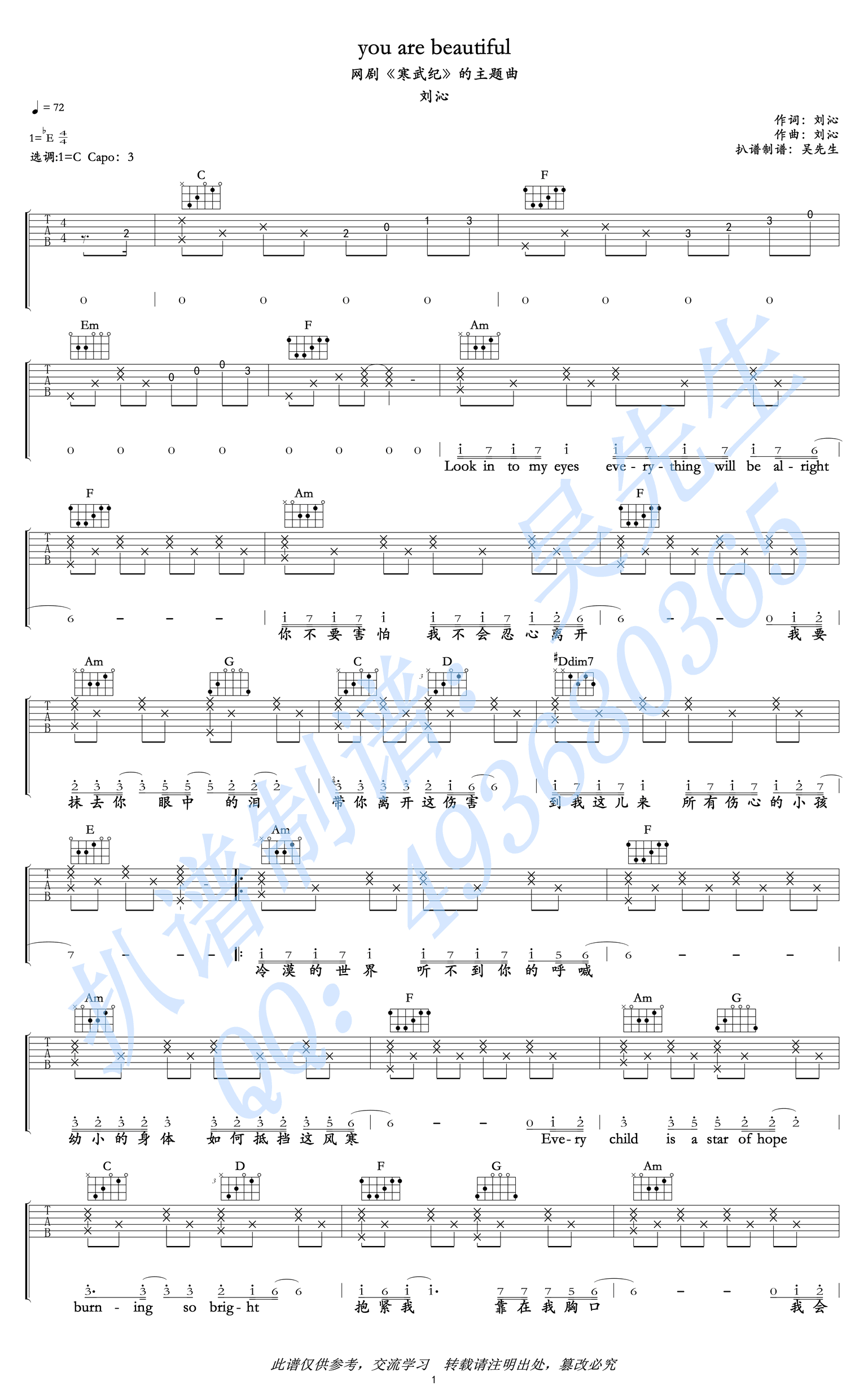 曲谱介绍: You are beautiful吉他谱,刘沁演唱,网剧《寒武纪》主题曲,原调降E,选用C调指法,变调夹夹第三品,感谢吴先生编配,91吉他谱网站上传。 《you are beautiful》是刘沁为这部悬疑加偶像剧所写的主题曲,从擅长的R&B风格里挣脱出来,创作型才女如水般的歌声让人在感受到不一样的温度。