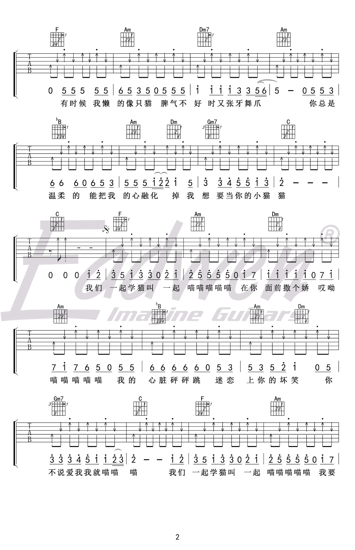 曲谱介绍: 学猫叫吉他谱,小潘潘小峰峰演唱的一首抖音神曲,甜蜜浪漫的歌声红遍整个网络,学猫叫六线谱,F调指法编配,变调夹夹第一品,感谢爱德文吉他编配,随谱附上配套吉他弹唱教学,琴友们跟随陈佰老师带来的讲解示范视频练习。一首小情歌,唱出情侣间最美好的恋爱状态,从初遇到羞涩、任性的包容到陪伴的告白。无处不在的纯爱气息扑面而来,让人瞬间回到18岁。