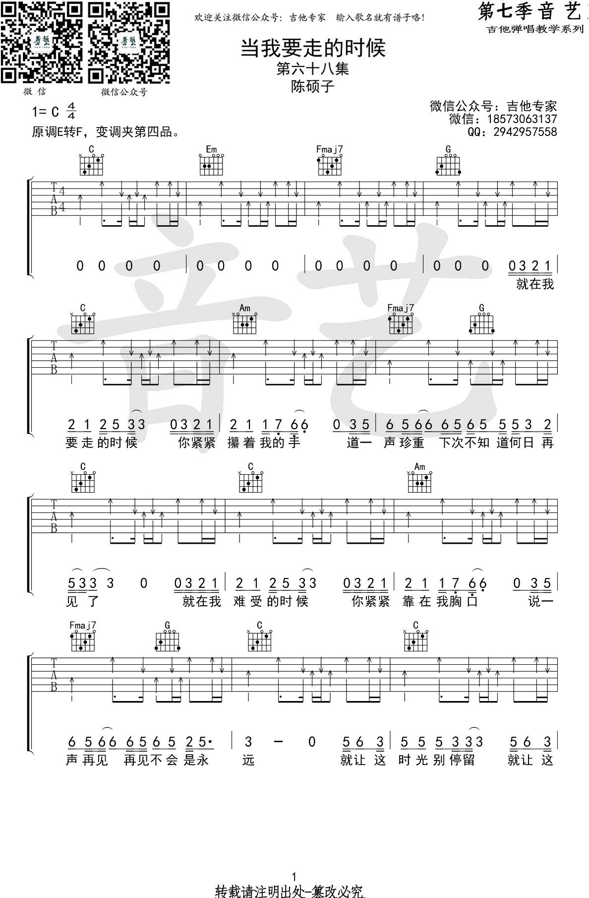 曲谱介绍: 陈硕子《当我要走的时候》吉他谱,C调指法编配,原调E转F,变调夹夹第四品。当我要走的时候六线谱,艺音出品,91吉他谱网站上传。 当我要走的时候,就让这时光别停留,就让这姑娘别回头。这首歌曲和声和歌词都挺简单的,感谢摇滚猫老师做了一个扫弦的版本,喜欢的小伙伴们可以开始咯!