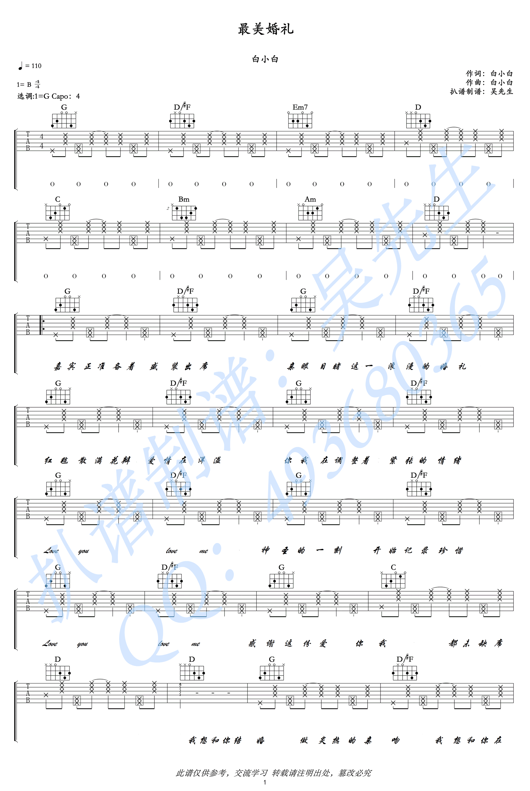 曲谱介绍: 白小白《最美婚礼》吉他谱,G调指法弹唱谱,Capo夹四品。这是继《最美情侣》后白小白又推出的一首告白神曲,最美婚礼吉他弹唱谱,高清图片六线谱,感谢吴先生编配,91吉他谱网站上传分享。 轻快动听的旋律,暖心浪漫的歌词,感觉每一秒都包裹在幸福甜蜜中,对最美的婚礼充满无限遐想和期待,愿与TA在爱里沉醉,一生一世相守相随。