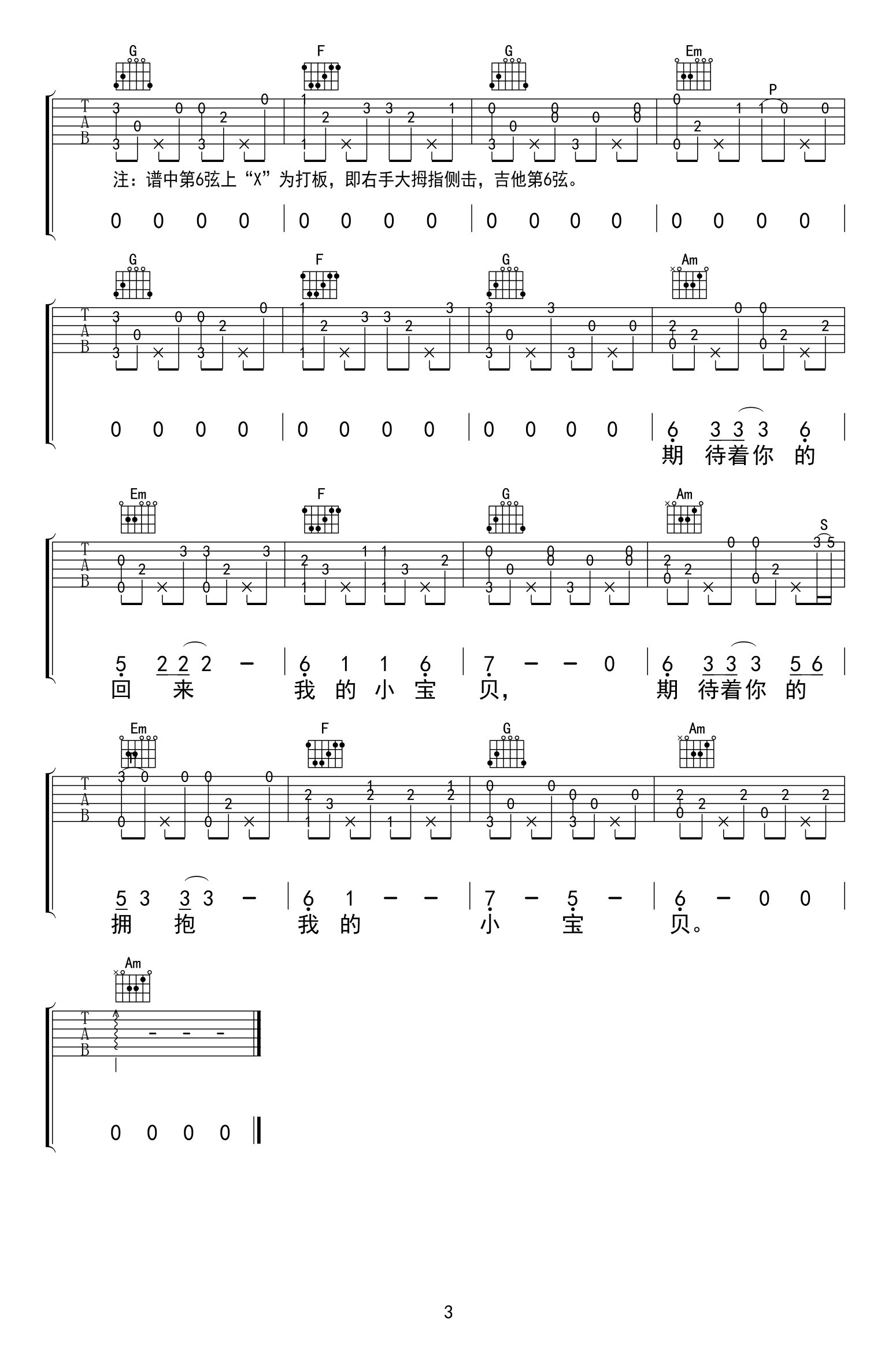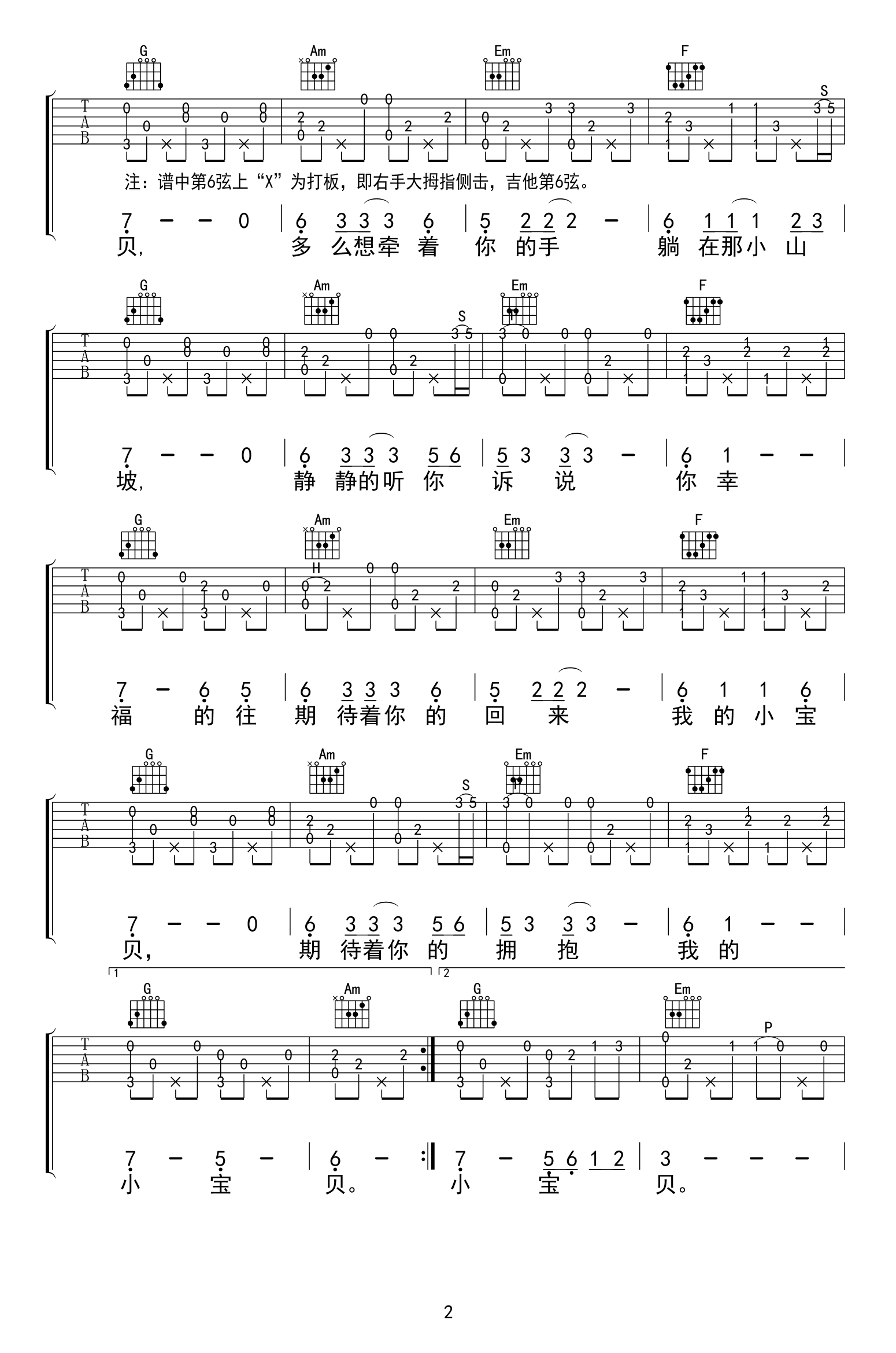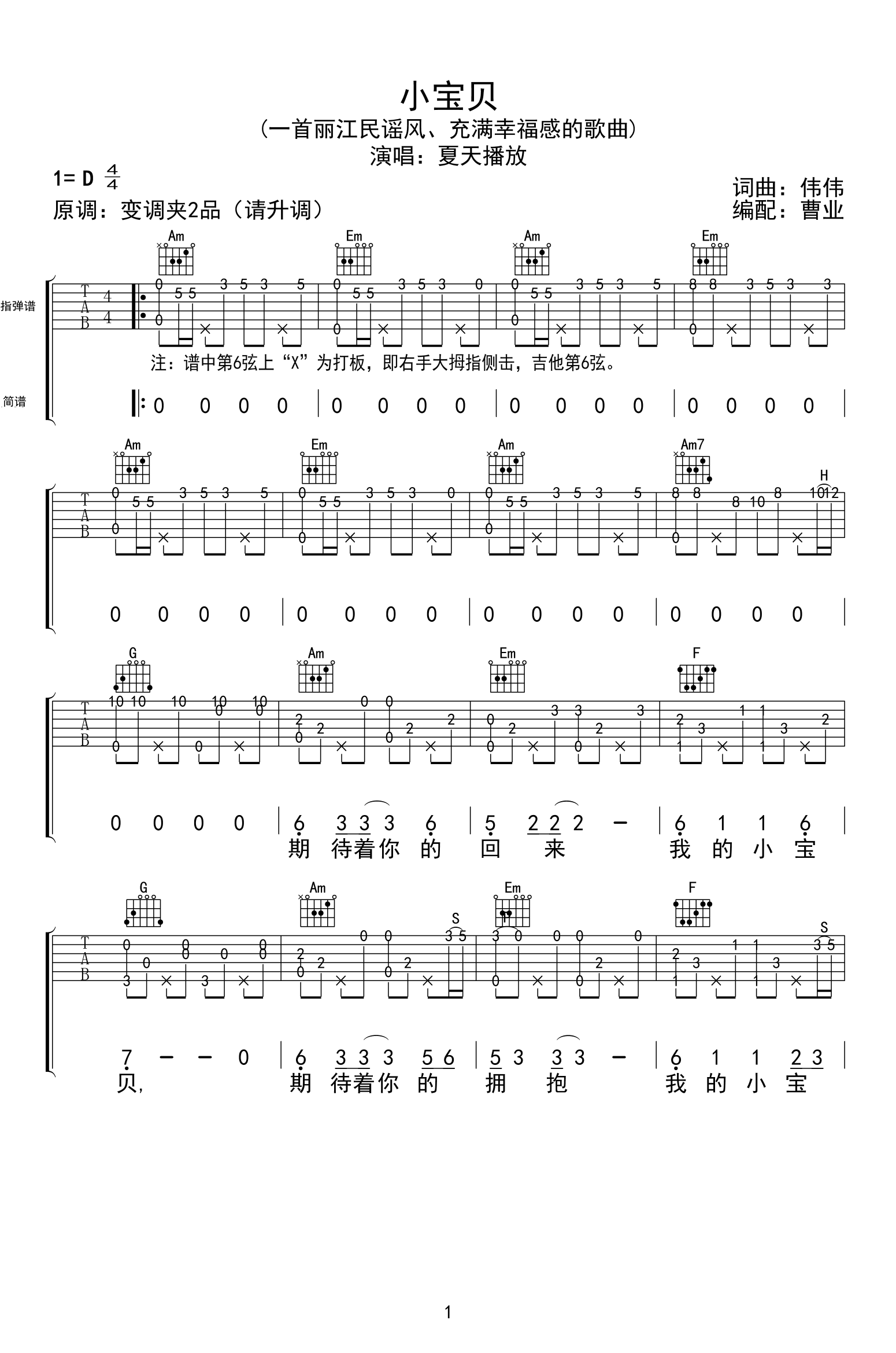 曲谱介绍: 小宝贝吉他谱指弹版,夏天播放演唱,原调变调夹夹二品(请升调),,一首充满幸福感的丽江民谣,小宝贝指弹吉他谱,三张高清图片谱。感谢曹业编配分享,91吉他谱网站上传。 编配说明:《小宝贝》原版指弹谱。谱中第6弦上“X”代表打板,即右手大拇指侧击,吉他第6弦。原调:变调夹请夹2品演奏,练习时请放慢速度,熟练后前奏、间奏请加速至原唱。该谱可指弹,也可跟唱。