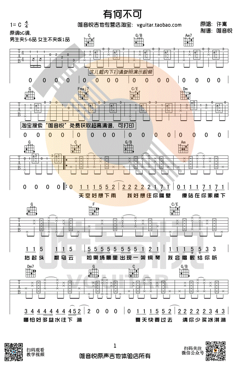 曲谱介绍: 《有何不可》吉他谱,许嵩的一首老歌,原调bG,选调C,男生变调夹夹5-6品,女生不夹或夹一品。有何不可六线谱,三张图片谱,唯音悦编配出品,91吉他谱网站上传。 编配说明:这首歌编配用的是C调,既兼顾了男生的调性也兼顾了女生调性,而且演奏难度相对来说还是比较低的,前奏方框大家如果不按照我的弹法可以直接当作没有方框正常演奏即可。歌曲整首的和弦走向都是统一的:C-G/B-Am-G-F-C/E-Dm7-G,前奏 主歌 副歌再到间奏全部都是都是这个统一的走向,所以要背好这首歌只需要把这几个和弦走向给记牢就行啦。