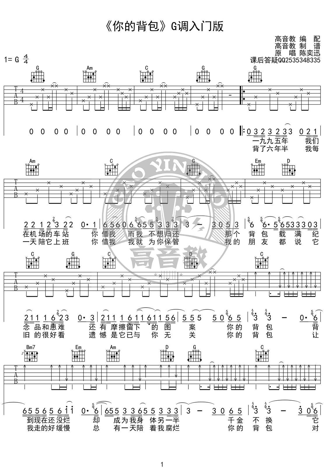 曲谱介绍: 《你的背包》吉他谱,G调指法入门版编配,陈奕迅演唱的经典歌曲,你的背包六线谱,两张图片谱,感谢高音教出品,91吉他谱上传分享。