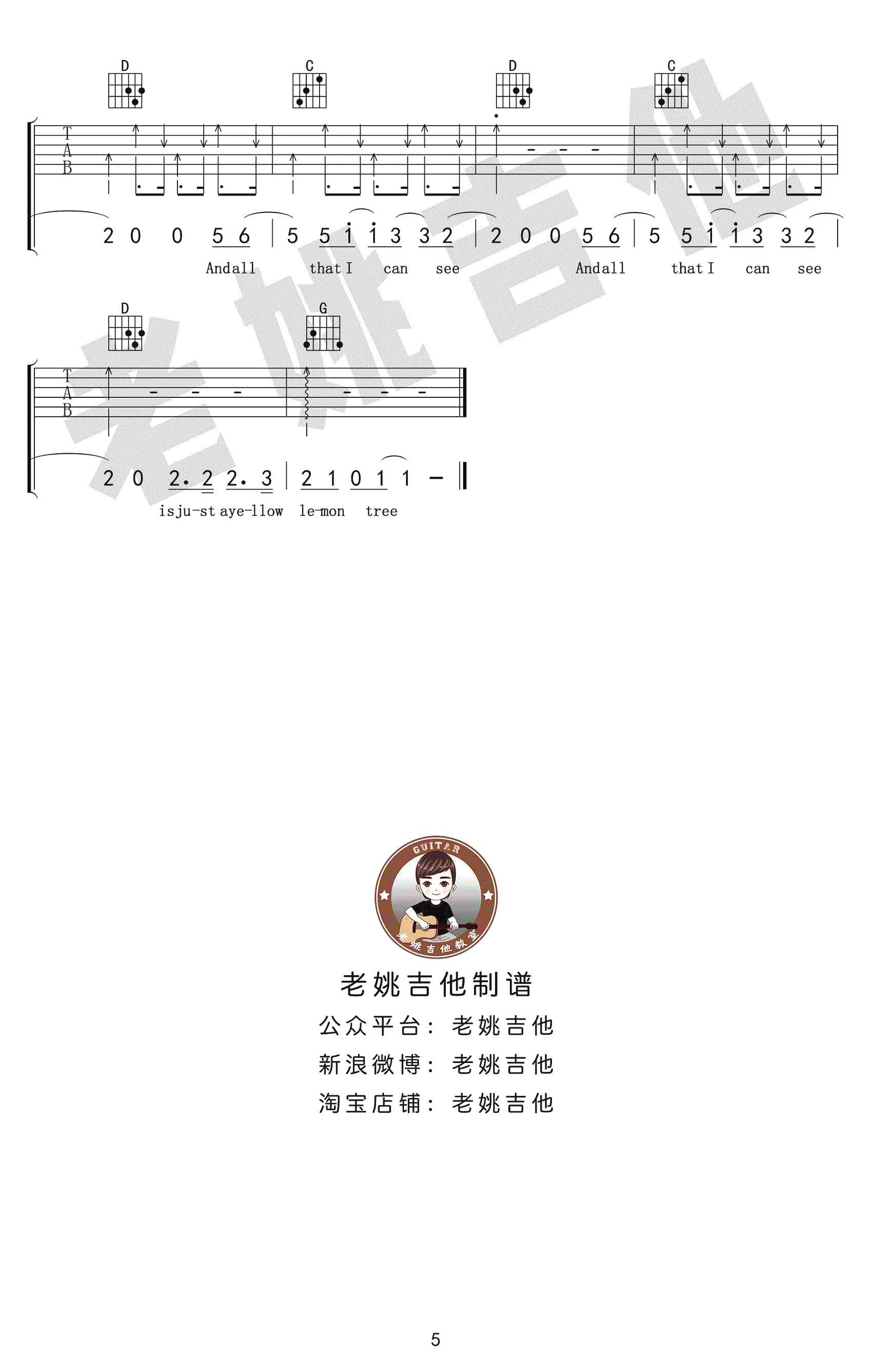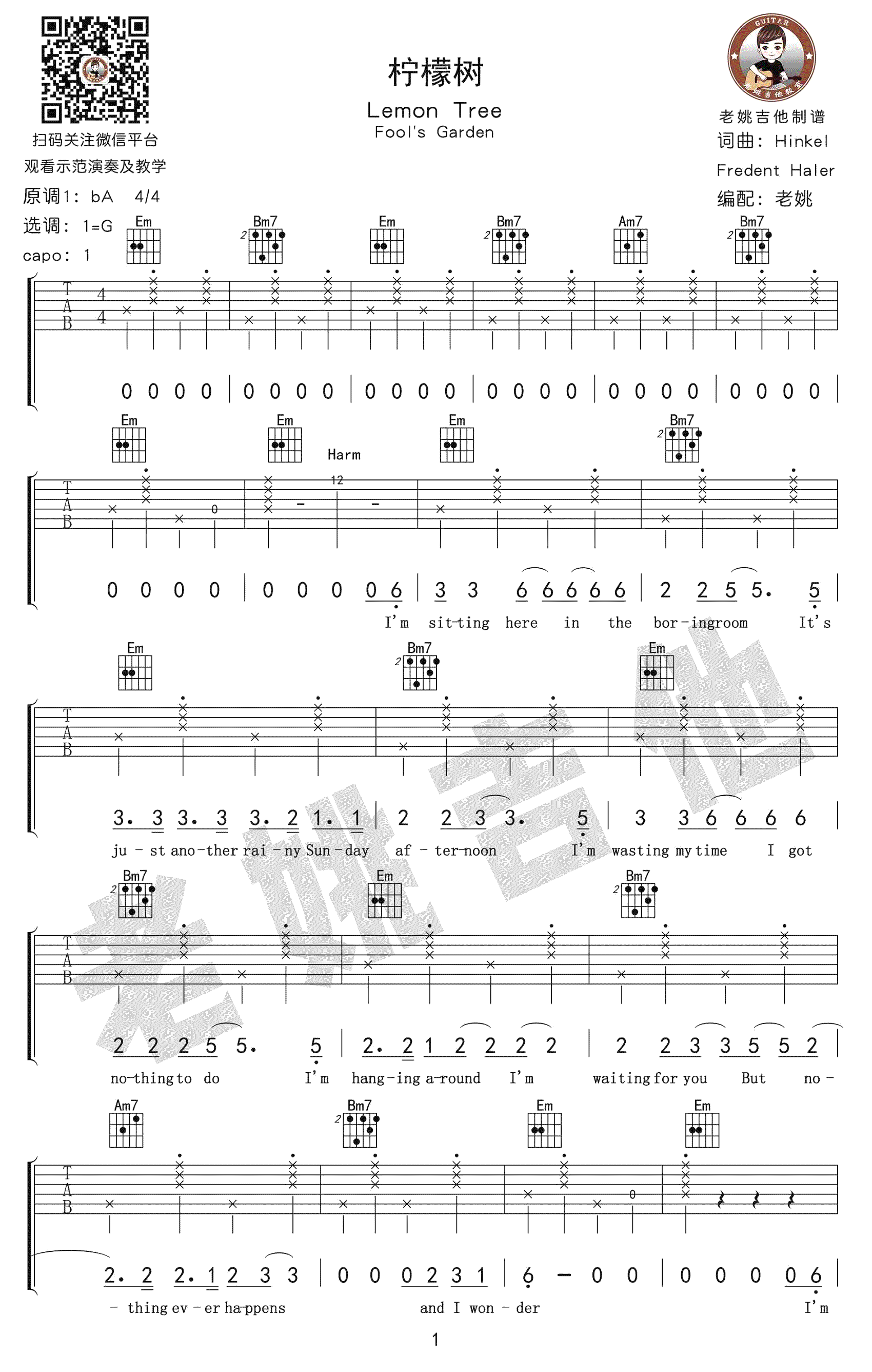 曲谱介绍: 《Lemon Tree》吉他谱,一首脍炙人口的经典英文歌曲,柠檬树吉他谱,原调bA,选用G调指法,变调夹夹一品。感谢老姚吉他编配,随谱附上配套吉他弹唱教学视频,91吉他谱网站上传推荐。《Lemon Tree》是一首由Fool's Garden(愚人花园)于1996年首唱的乡村歌曲,使这支原本寂寂无名的德国5人乐队一下子红遍欧洲,在被苏慧伦翻唱后也开始为国人熟知。 吉他弹唱演示及视频教学
