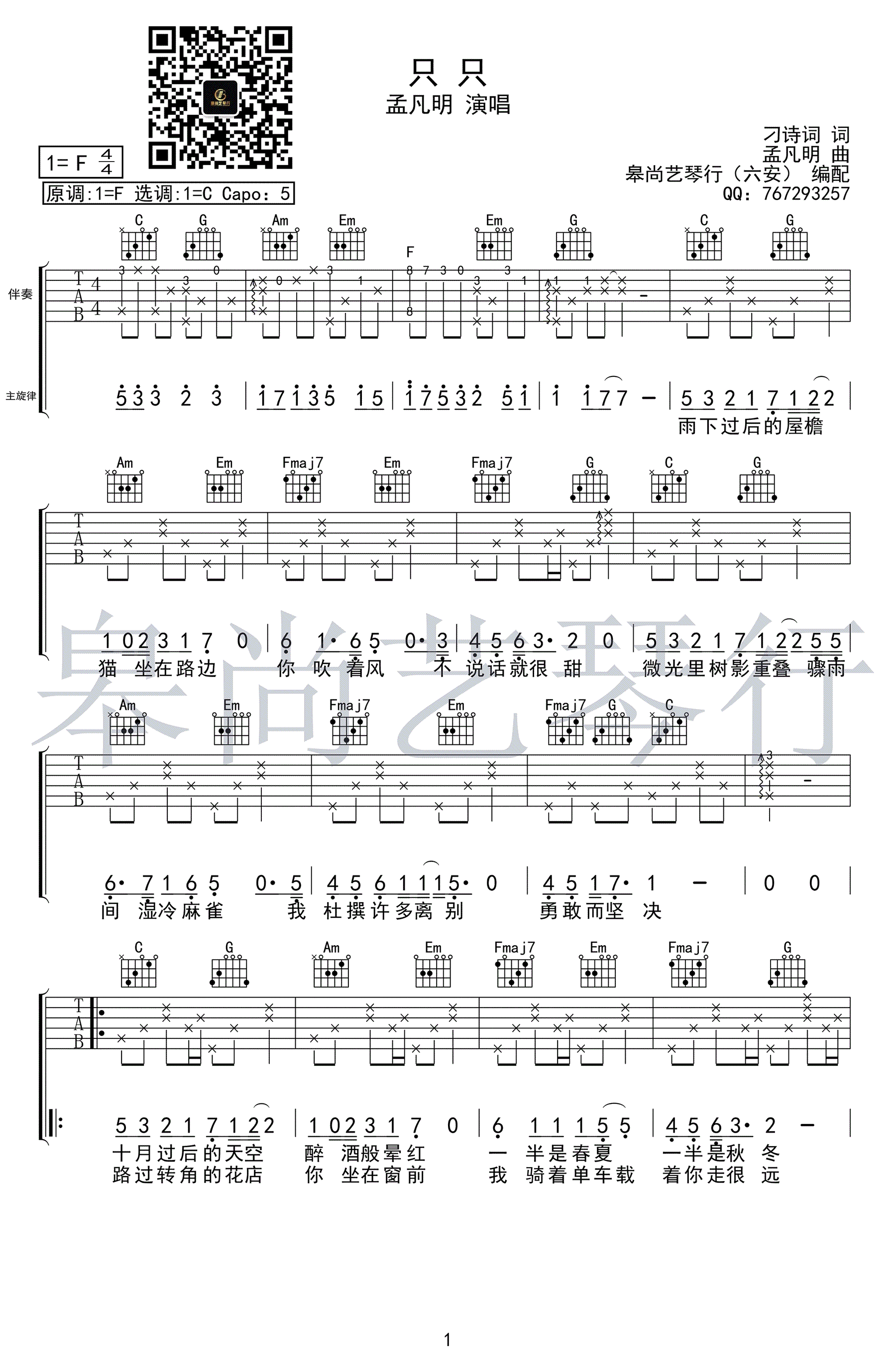 只只吉他谱 - 孟凡明 - C调吉他弹唱谱