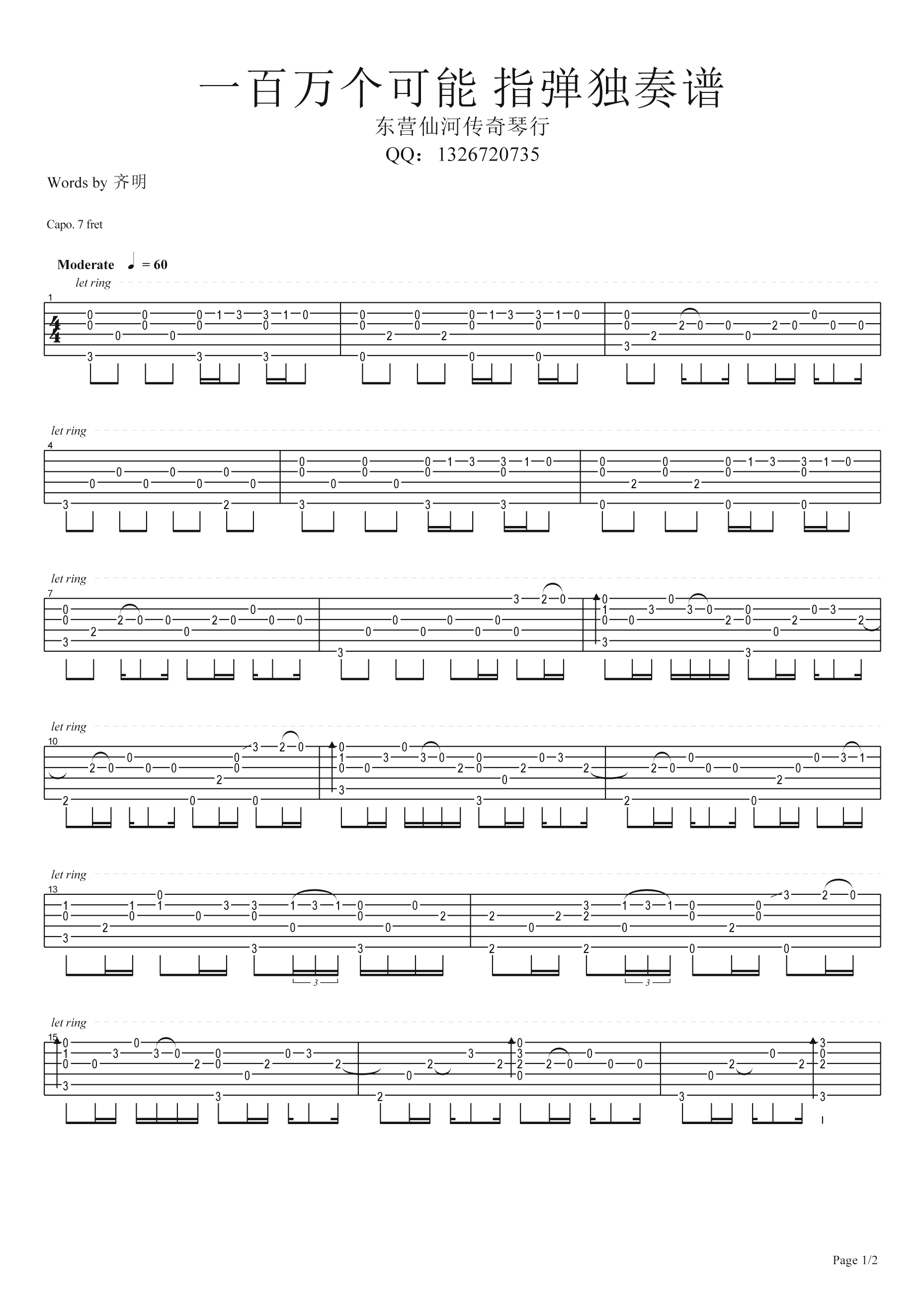 曲谱介绍: 一百万个可能指弹谱,美国小妞Christine Welch克丽丝叮的一首爆好听中文原创歌曲改编,一百万个可能吉他独奏谱,Capo夹七品,高清图片谱,感谢传奇琴行出品,91吉他谱网站上传分享。 这是一首励志暖歌,唱出我们心中的希冀和感动,在吉他动听的琴音中,将情感激发出来,幻化成寒冬后的冰凌结晶,街道暖灯,让人意犹未尽。