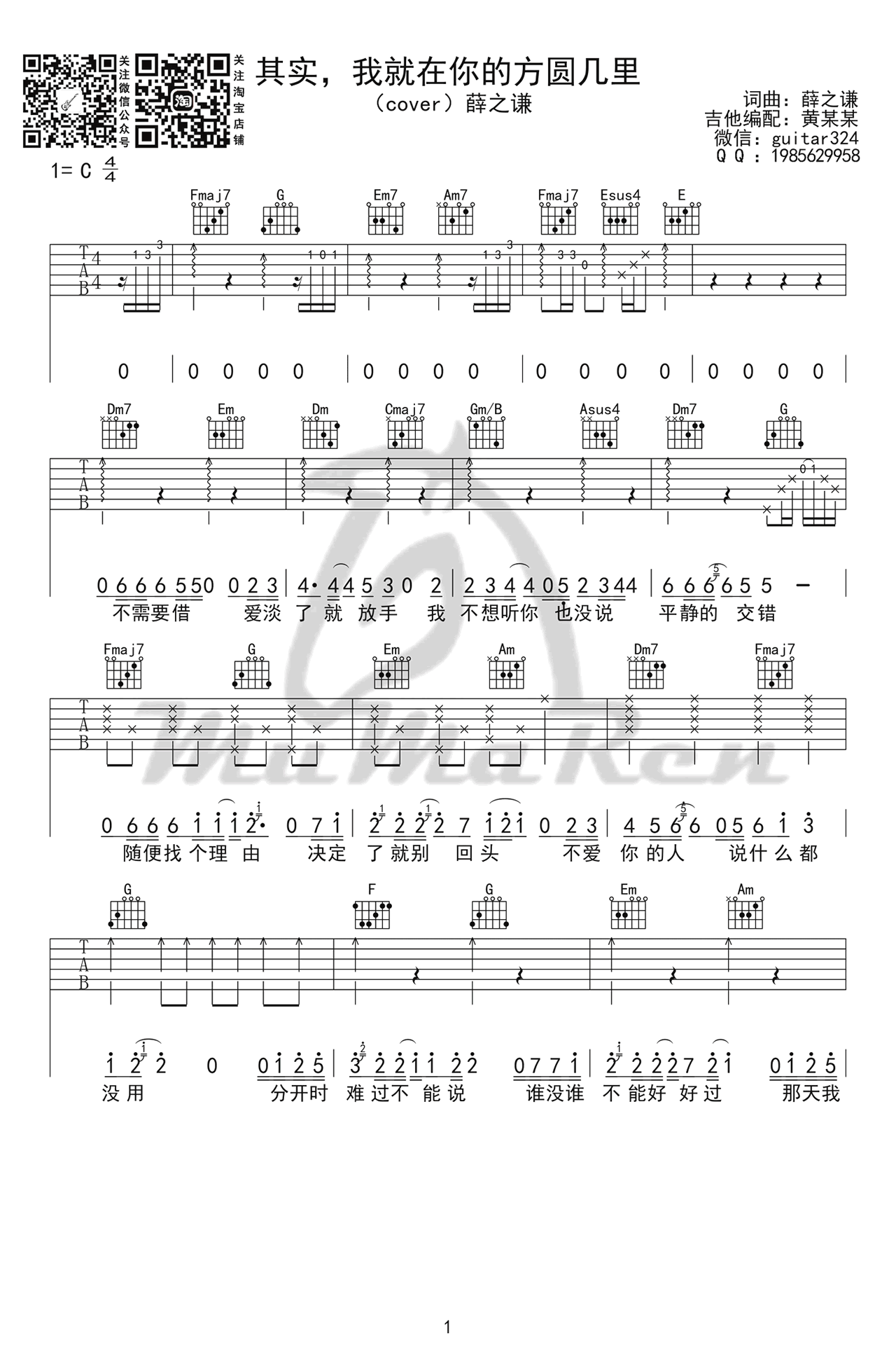 曲谱介绍: 其实我就在你的方圆几里吉他谱,C调弹唱谱,薛之谦歌曲串烧,完整版共四张高清图片谱例,感谢牧马人乐器黄老师编配,91吉他谱网站上传推荐。这首歌是一首改编翻唱,是“其实”和“方圆几里”的串接版本,不得不说两首歌编曲方式很相近,老薛可能是故意的好让别人去完美衔接,前奏部分刚好融合了两首歌,这首歌很适合学习、 吉他弹唱演示示范视频