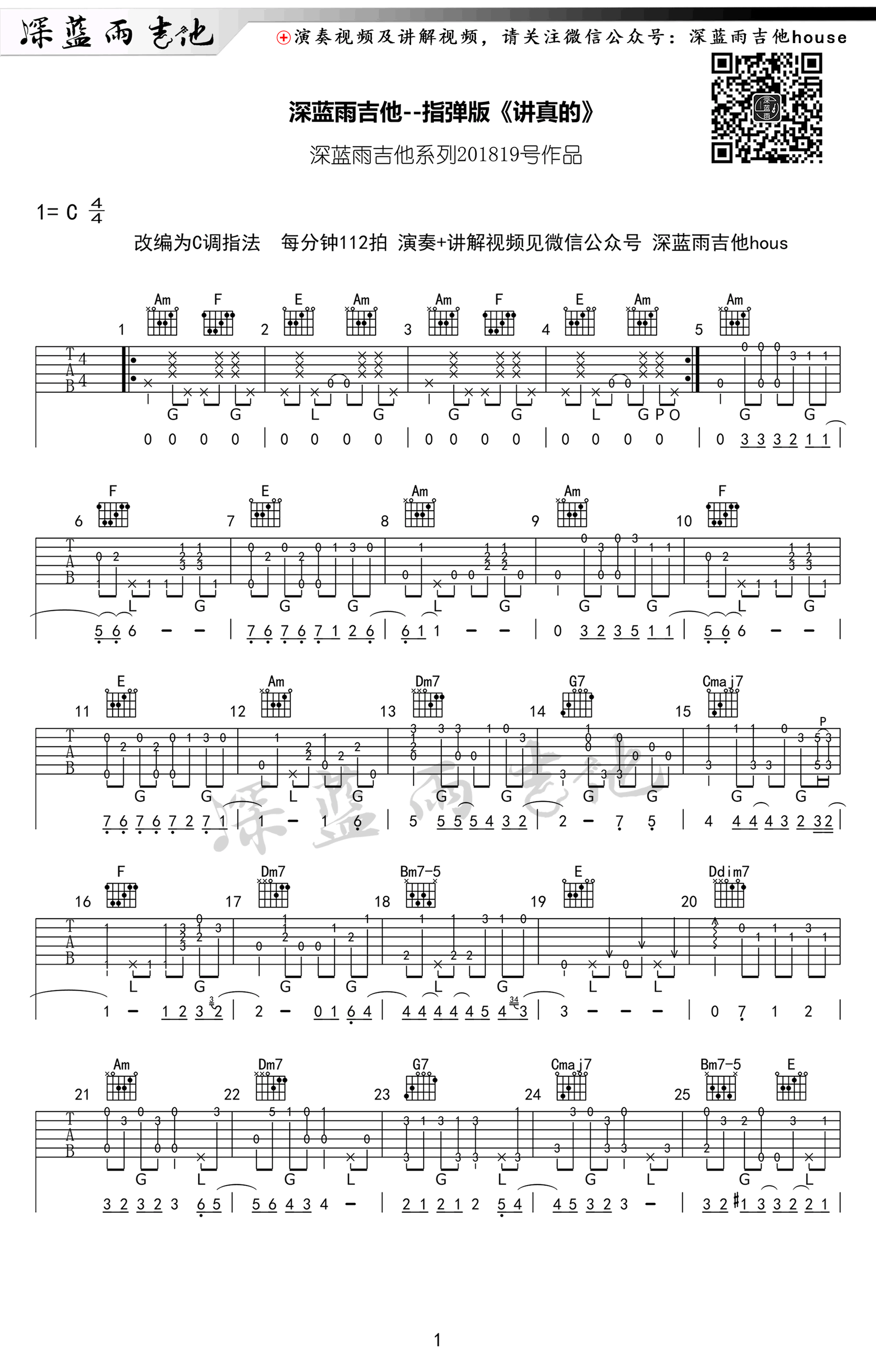 曲谱介绍: 讲真的指弹谱,曾惜的一首热门抖音歌曲改编,摩登兄弟的翻唱演绎也风靡一时。讲真的吉他独奏谱,C调指法,每分钟112拍,高清图片谱,深蓝雨吉他编配出品。随谱附上《讲真的》指弹吉他教学视频。 吉他指弹视频讲解教学