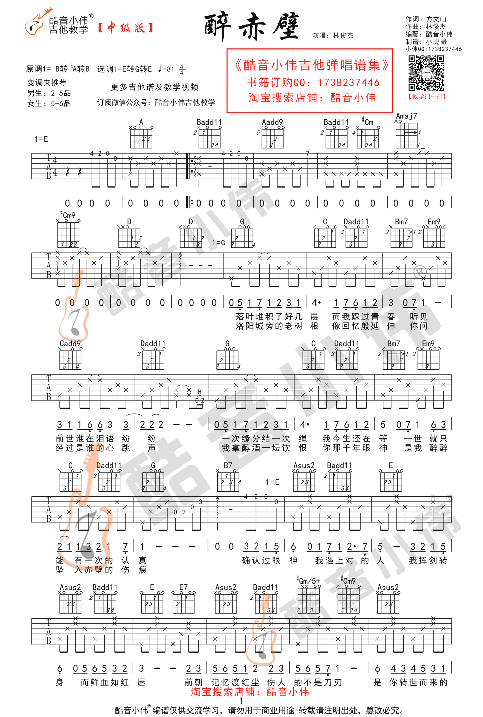 曲谱介绍: 《醉赤壁》吉他谱,林俊杰一首因为抖音平台再次火起来的老歌,确认过眼神,我遇上对的人。醉赤壁六线谱,高清图片谱,感谢酷音小伟编配出品,并提供中级版教学谱和简单版入门谱,方便不同阶段的琴友选择练习。随谱附上配套吉他弹唱教学,喜欢这首歌曲的可以跟随小伟老师的示范讲解学习。一首穿越时空的缠绵情歌,唯美婉转的旋律让人陶醉。 吉他弹唱演示及视频教学