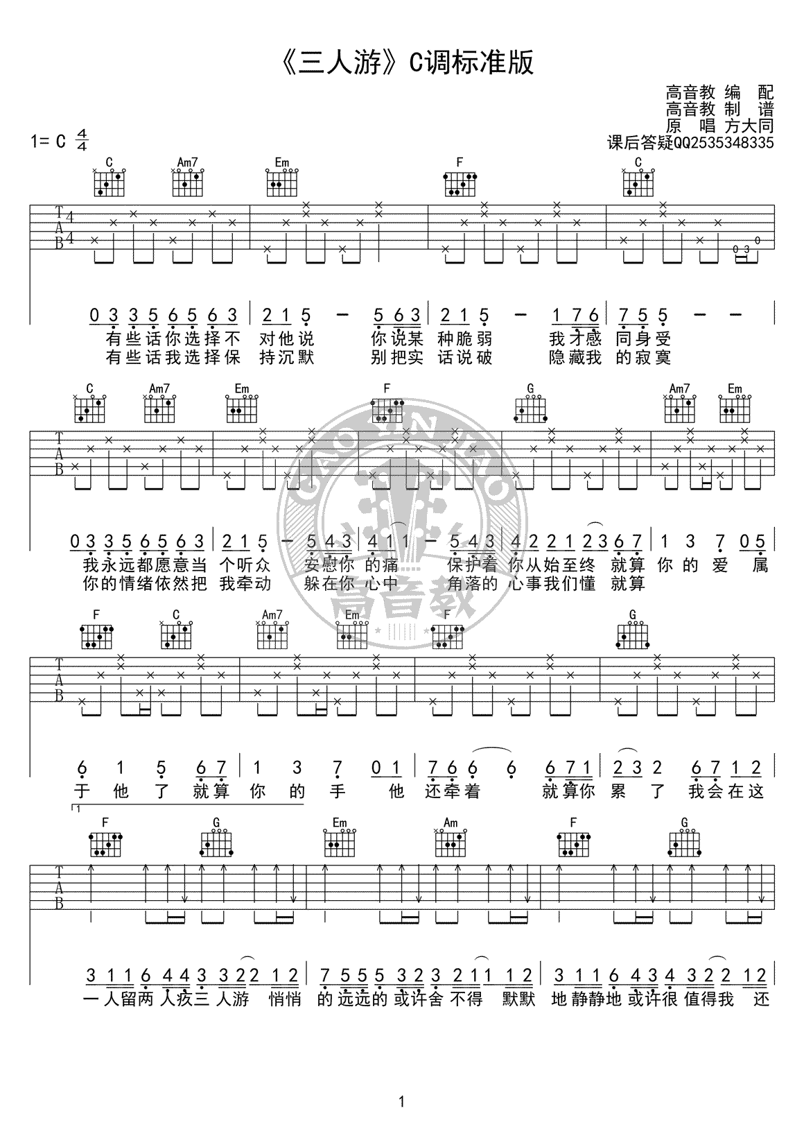 曲谱介绍: 《三人游》吉他谱,C调标准版,方大同演唱的代表歌曲,韩剧《冬季恋歌》中文版主题曲,三人游六线谱,吉他弹唱图片谱由高音教编配出品,91吉他谱网站上传。