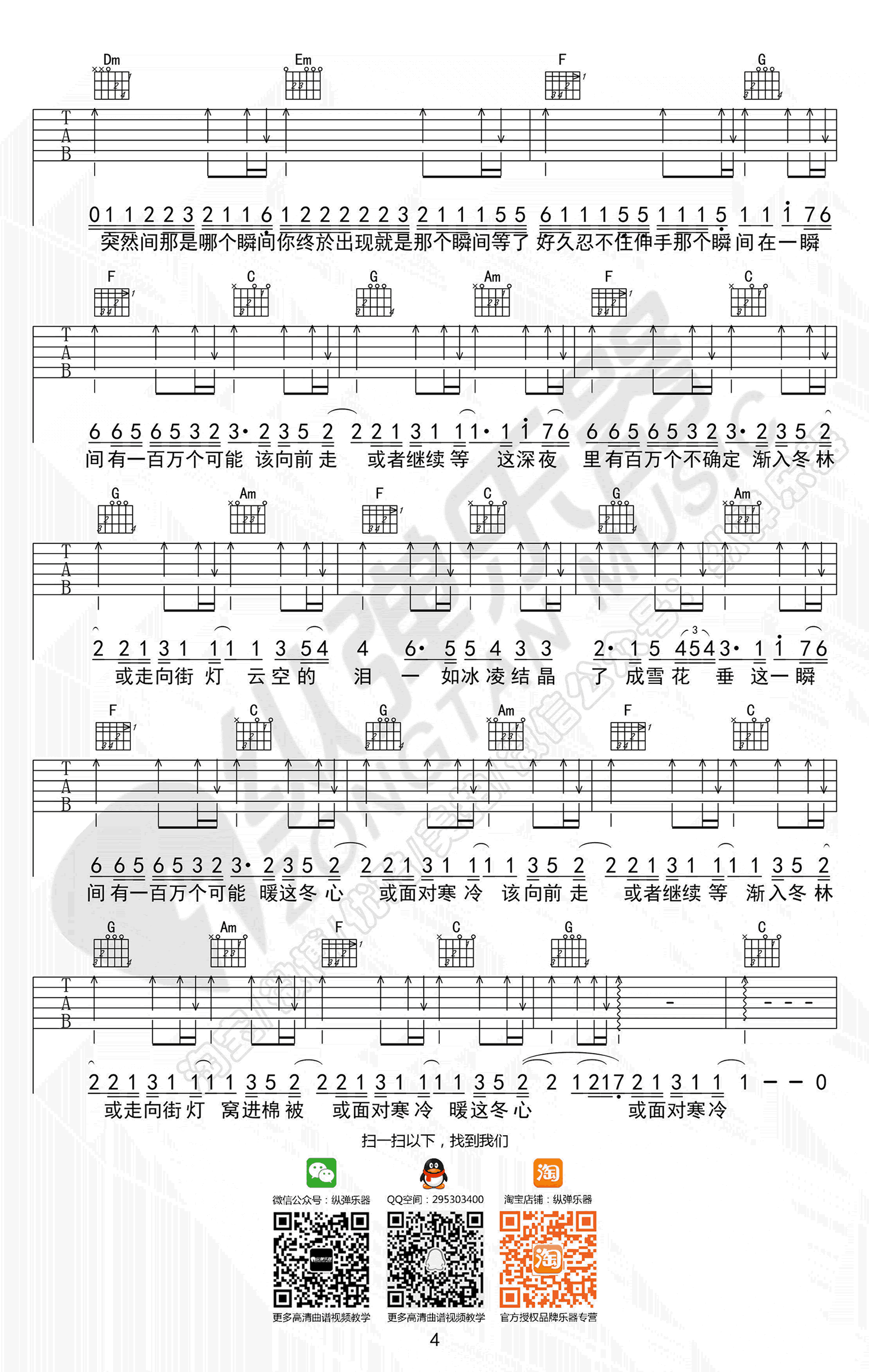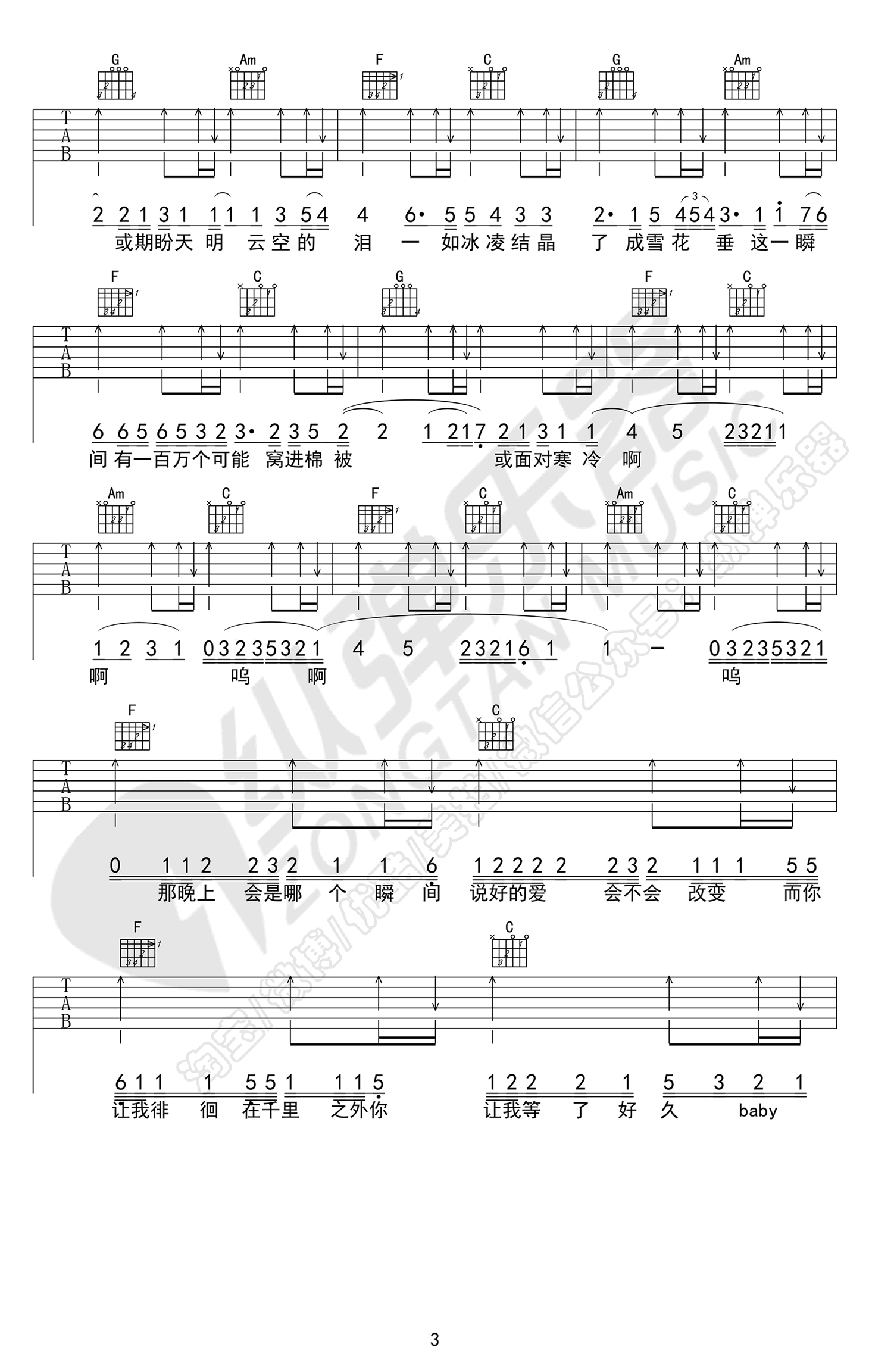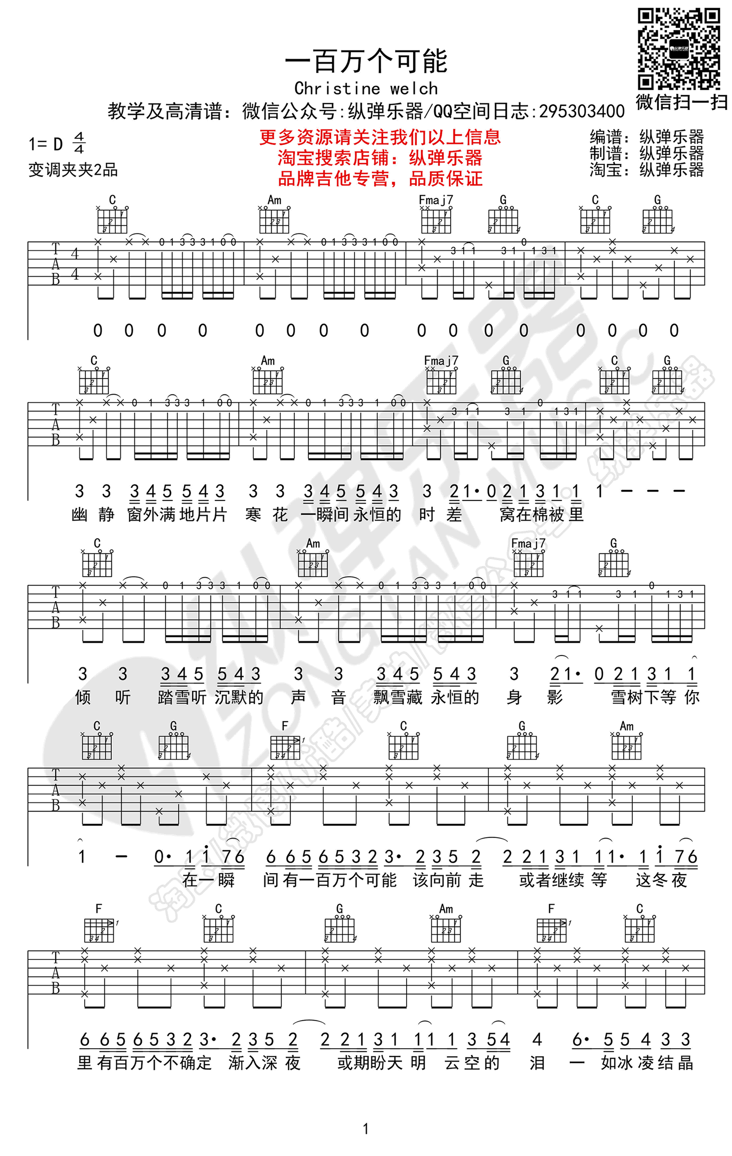 曲谱介绍: 一百万个可能吉他谱,中文十级的外国妹子Christine Welch(克丽丝叮)演唱,超好听单曲循环的抖音爆火歌曲,《一百万个可能》六线谱,四张高清弹唱谱,变调夹夹第二品,纵弹乐器编配出品,91吉他谱网站上传。
