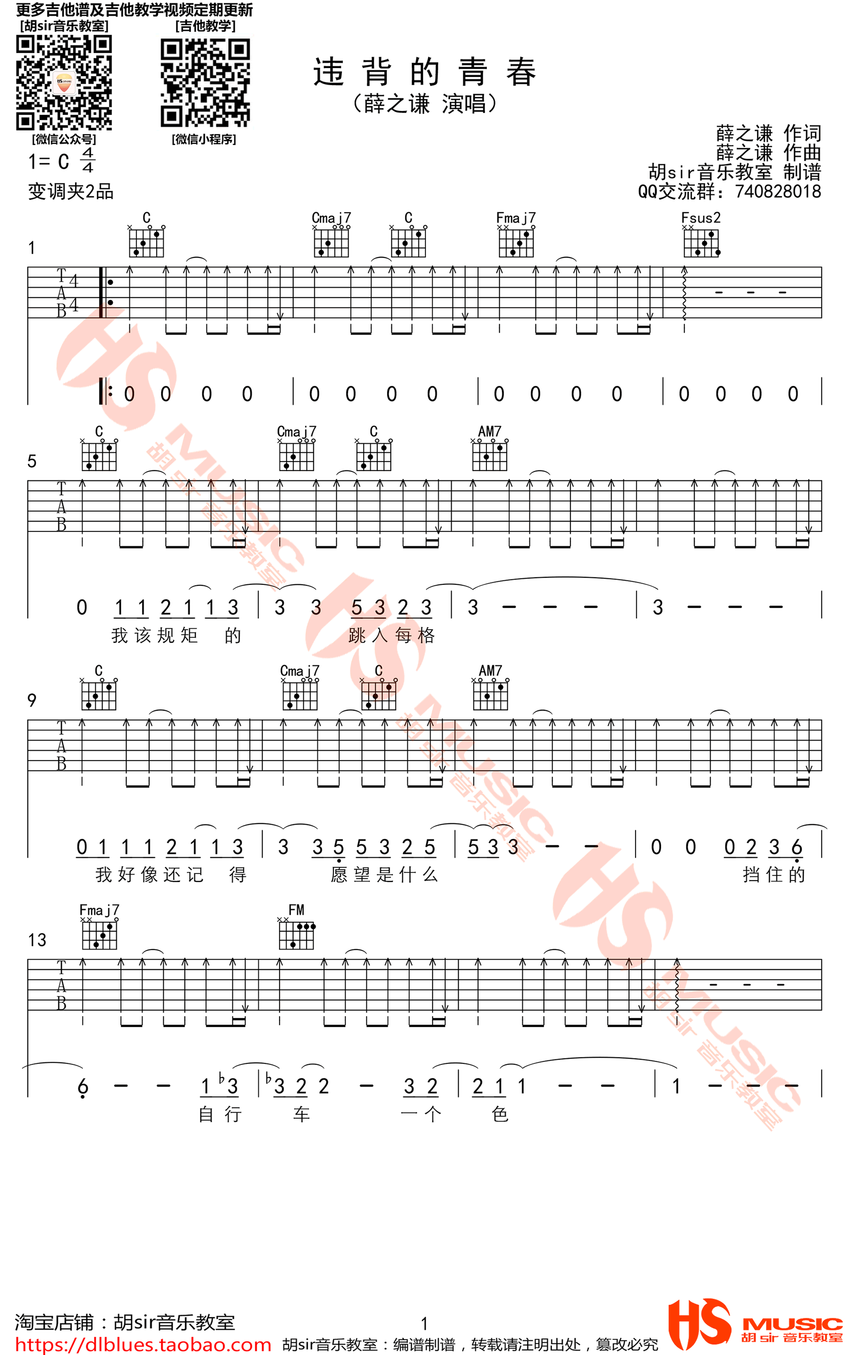 曲谱介绍: 《违背的青春》吉他谱,薛之谦演唱的新歌,C调指法编配,变调夹夹二品。违背的青春吉他弹唱谱,六线谱图片格式三张谱例,感谢胡Sir音乐教室出品,91吉他谱网站上传分享。