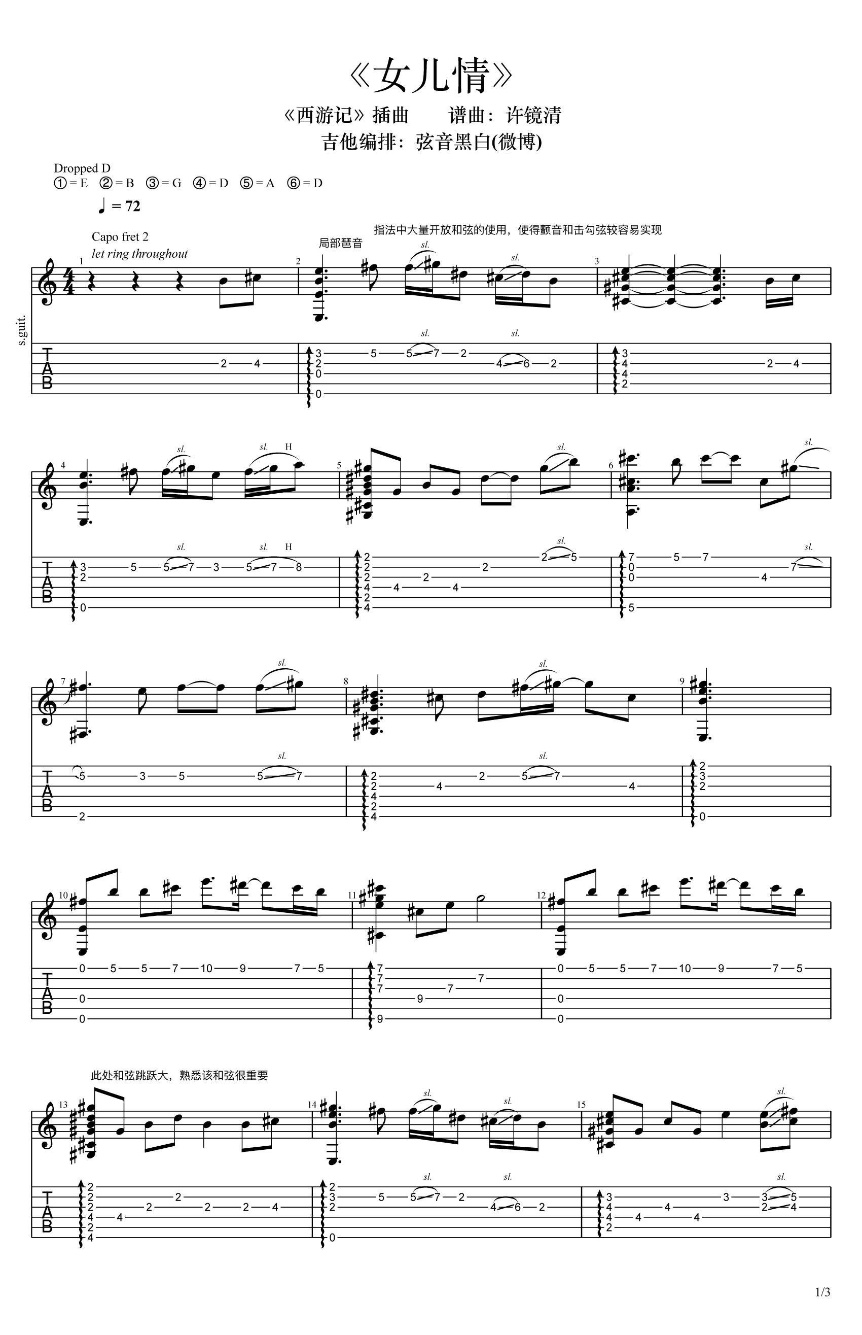 曲谱介绍: 女儿情指弹谱,DropD调弦版本,电视剧《西游记》插曲,女儿情吉他独奏谱,三张图片谱。感谢弦音黑白编排,91吉他谱上传。 老师编配说明: 如果让你说一首《西游记》的主题曲,除了diudiudiu和你挑着担,那么印象最深的一定莫过于这首歌! 这首歌的旋律优美动人,很多人也将其编排成吉他独奏。生硬的指法弹奏效果差,弹奏效果好一些的指法基本都逆天了! 因此,自己就闲来无事重新编排了一番。 采用Drop D调弦,开放了大量和弦,指法简单也兼顾优美旋律。