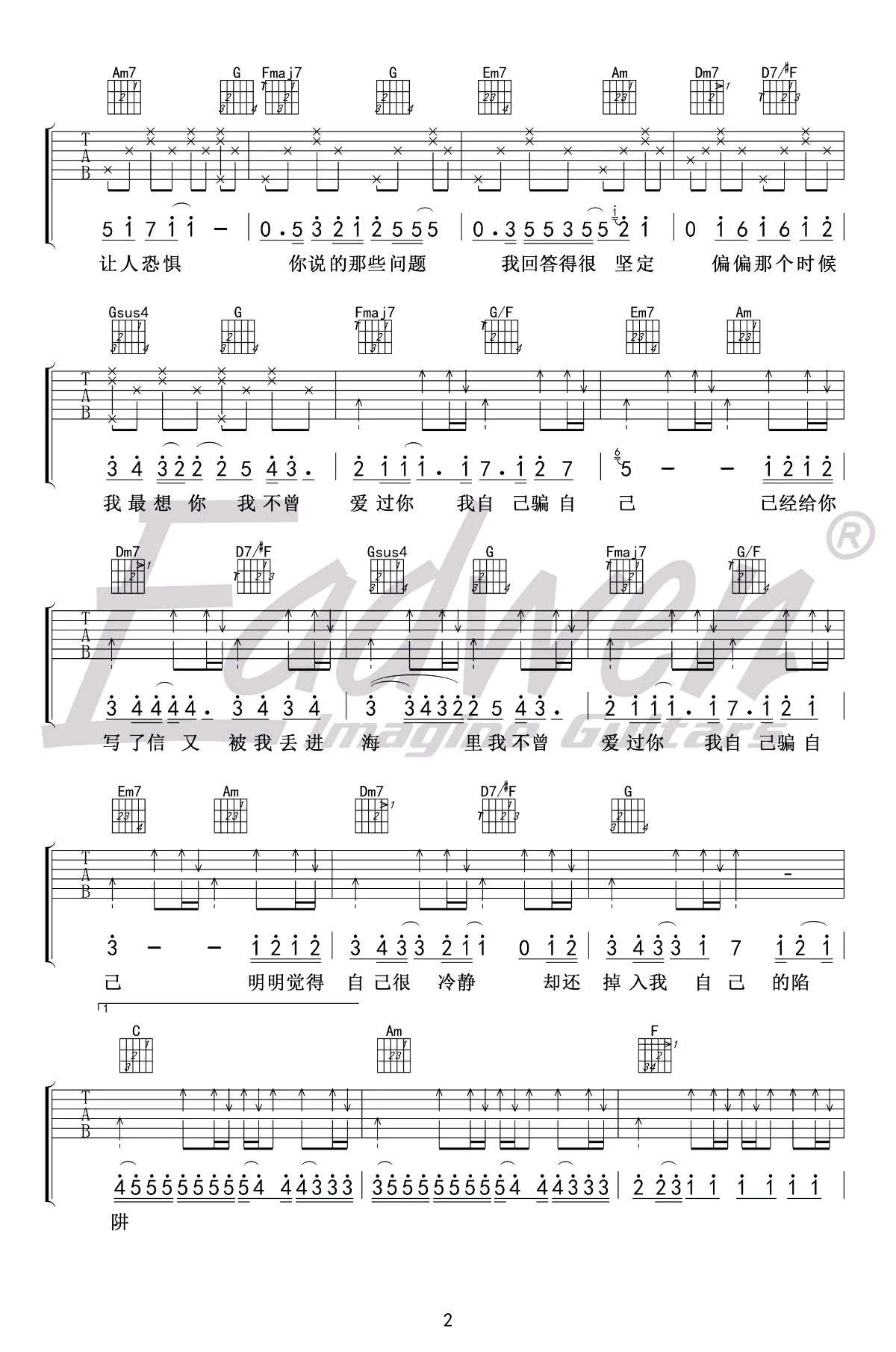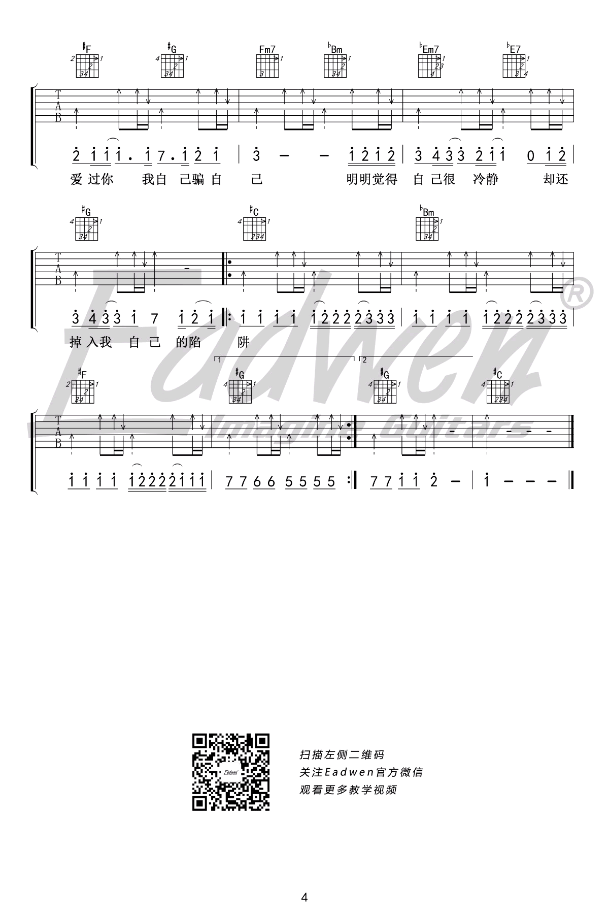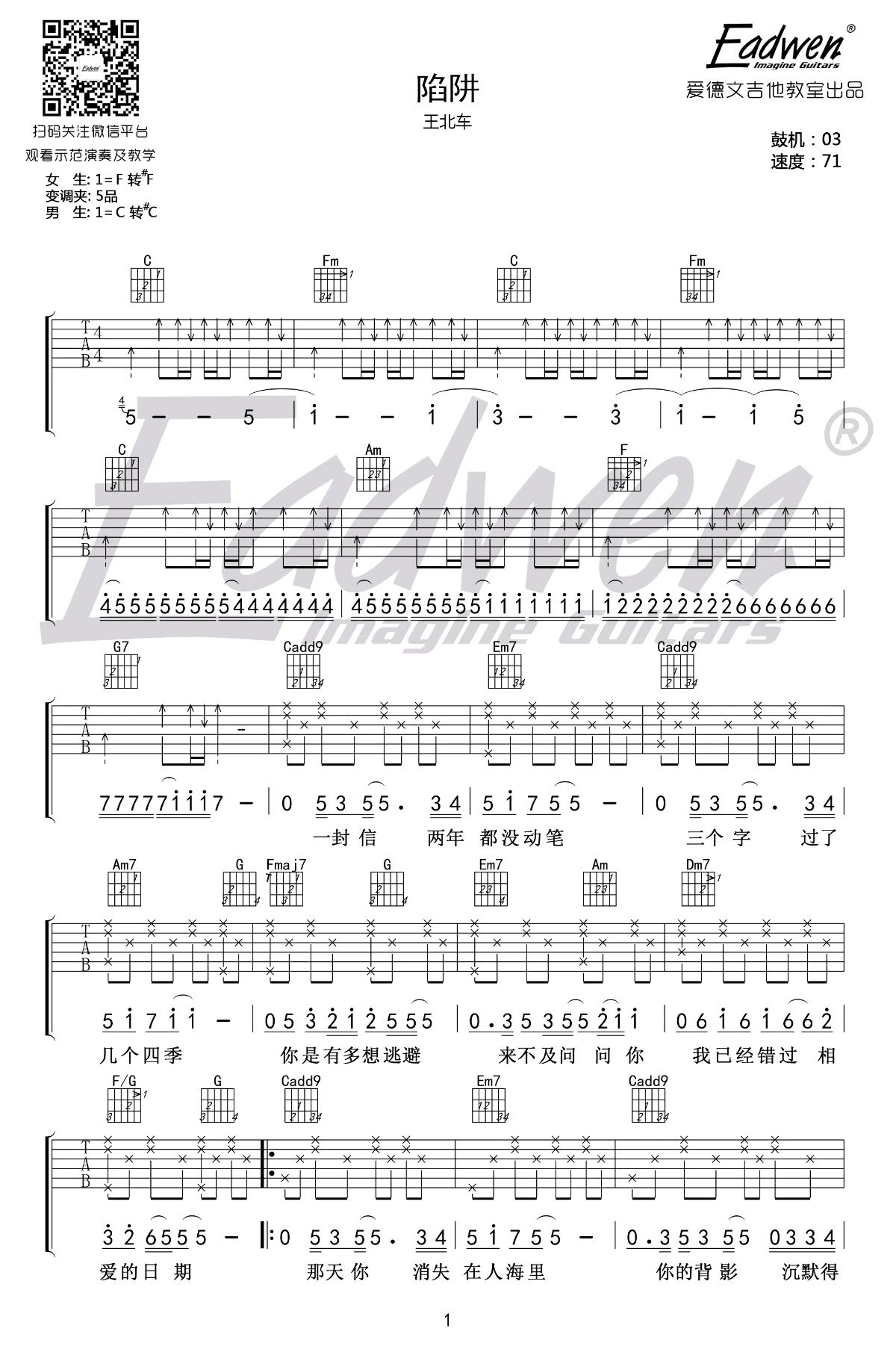 曲谱介绍: 《陷阱》吉他谱,王北车演唱,红遍抖音的热门歌曲,女生F转#F调,变调夹夹五品,男生C转#C调,爱德文吉他编配出品。随谱附上陈佰老师带来的《陷阱》吉他弹唱教学视频,琴友们可以跟随示范讲解练习起来。愿你心甘情愿义无反顾地往下坠入的爱情陷阱,能够变成你一生最美的风景。 吉他弹唱演示及视频教学