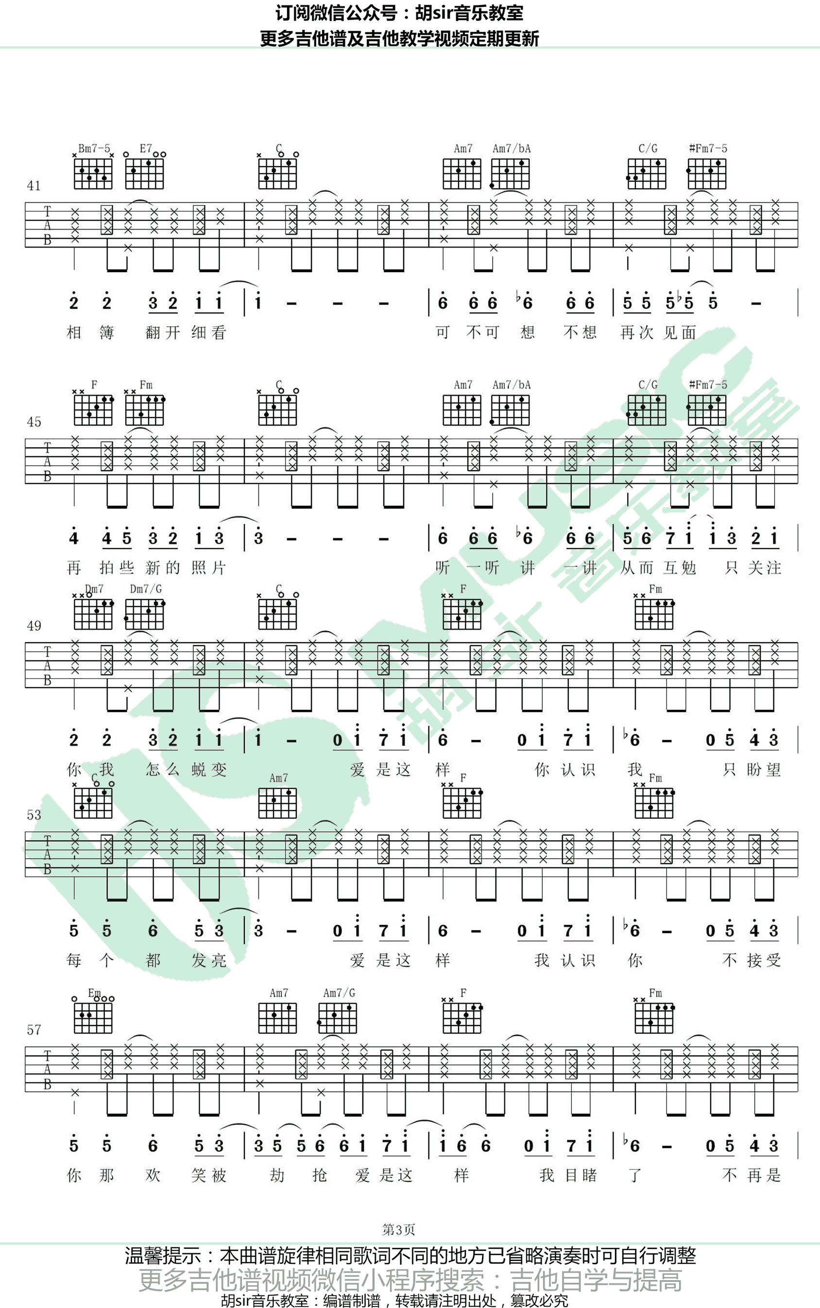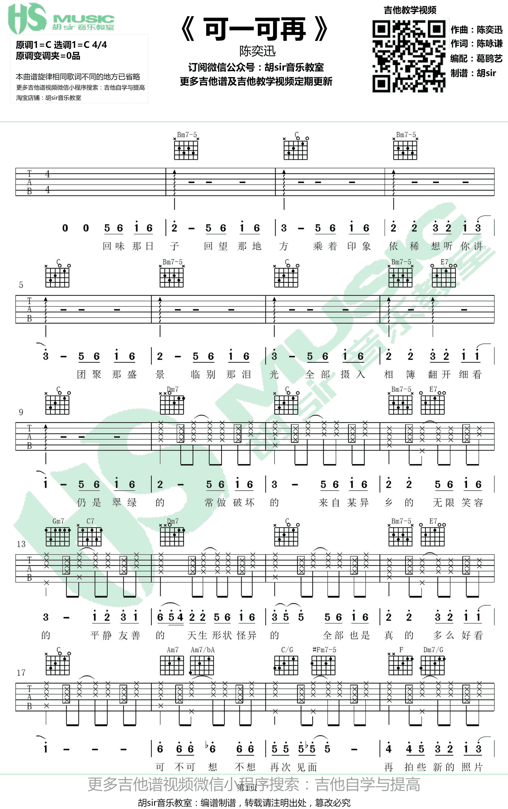 曲谱介绍: 《可一可再》吉他谱,陈奕迅全新粤语歌曲,选用原调C编配,无需变调夹,可一可再吉他弹唱谱,四张高清图片六线谱,感谢胡Sir音乐教室出品,91吉他谱网站上传推荐。 淡然的曲风,真挚的歌声,犹如翻开一本泛黄的相簿,歌声带我们回首过往的点滴,让人感受到曲中满满的幸福感。歌曲整个氛围充满了温暖的爱意,如同睡在棉花里一样的温暖,让人不由自主的“深陷”其中。