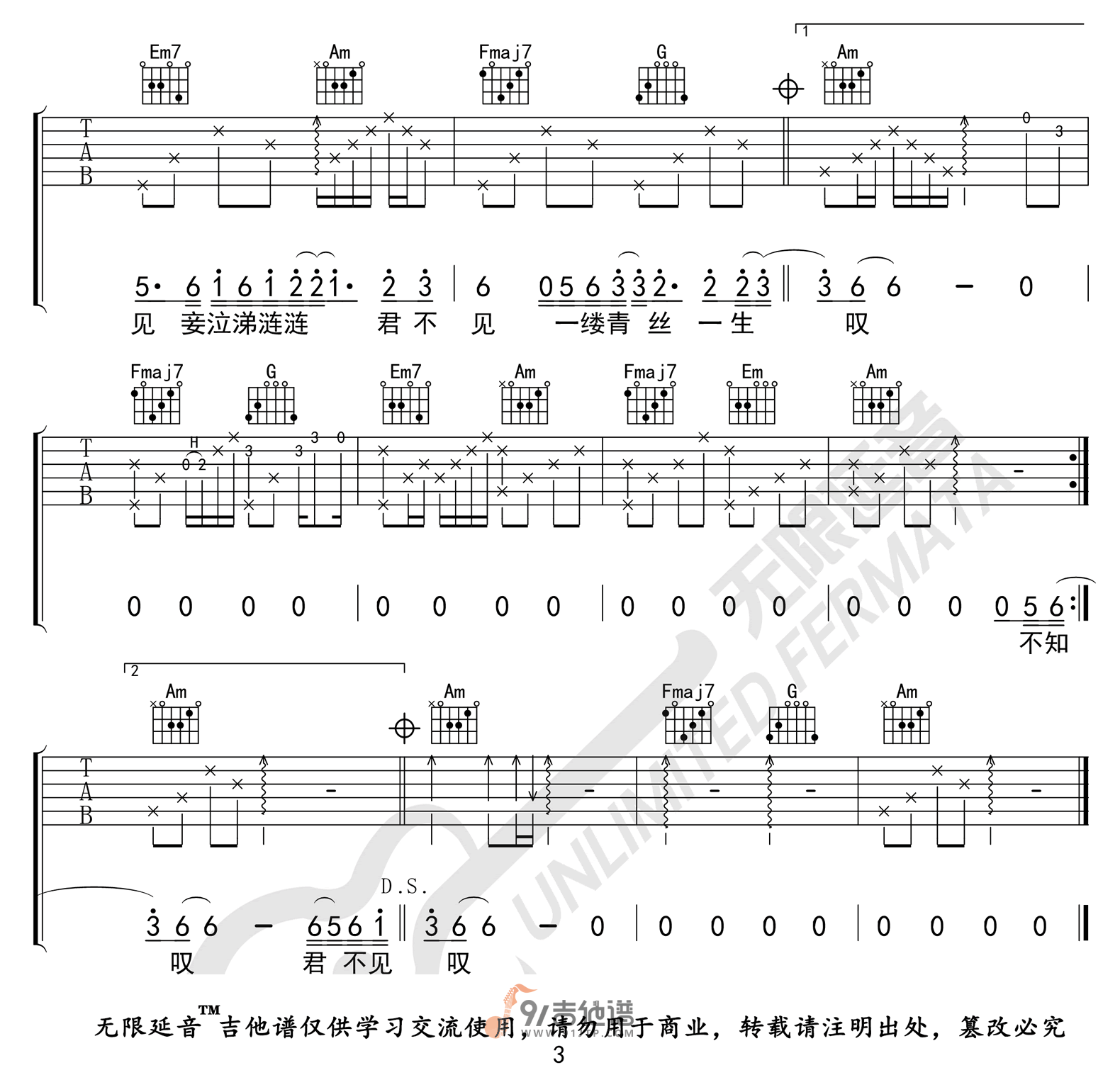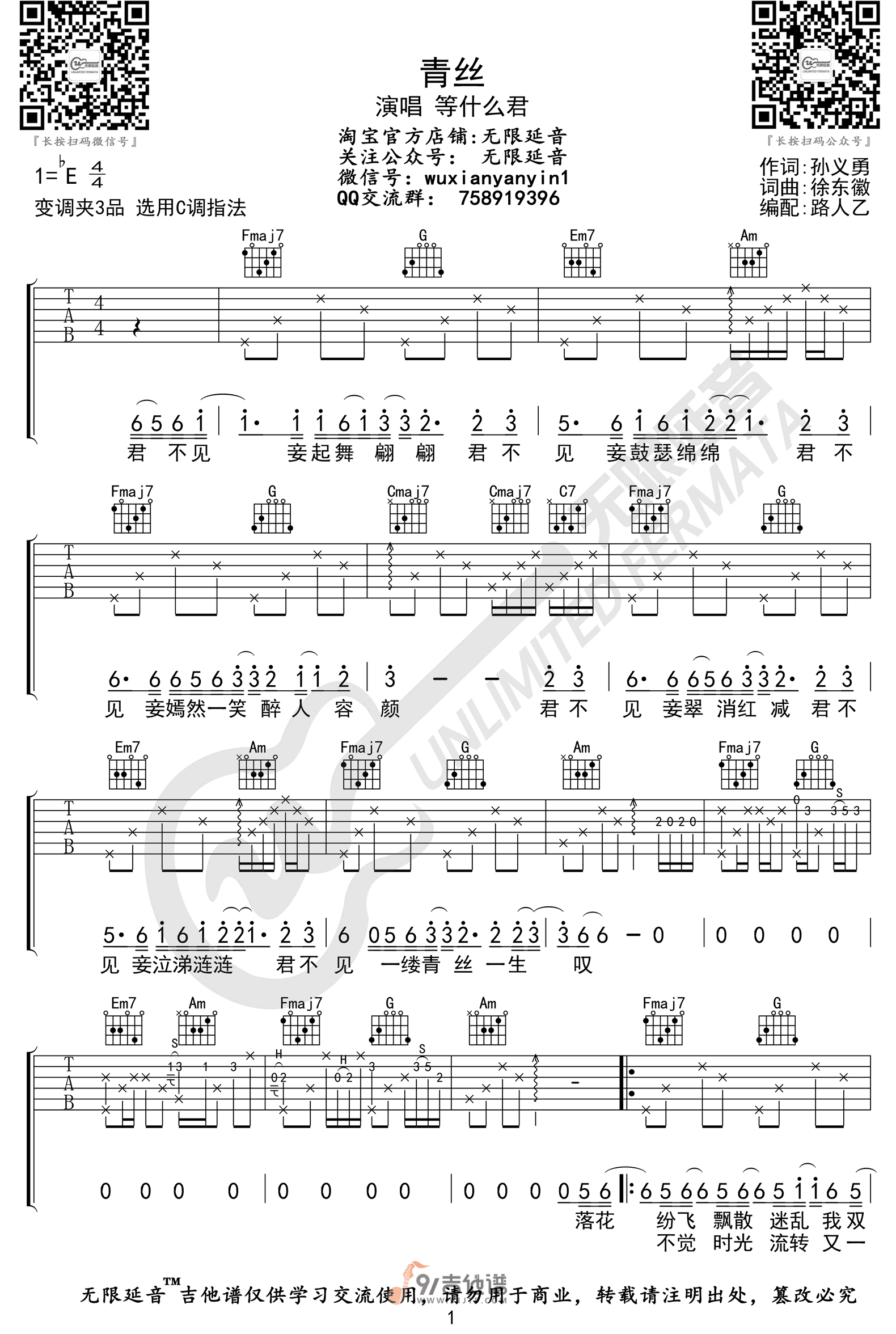 曲谱介绍: 曲谱简介:青丝吉他谱,等什么君演唱的一首歌曲,4/4拍的节奏,这首歌曲的原调为降E调,这里曲谱采用了C调指法进行编配,演唱时夹变调夹3品可回到原调,也可根据个人实际嗓音情况选择。曲谱由无限延音编配出品。这首歌原唱是时光胶囊乐队,最近等什么君翻唱的版本在网络上比较火。君不见妾起舞翩翩,君不见妾鼓瑟绵绵,君不见妾嫣然一笑醉人容颜。