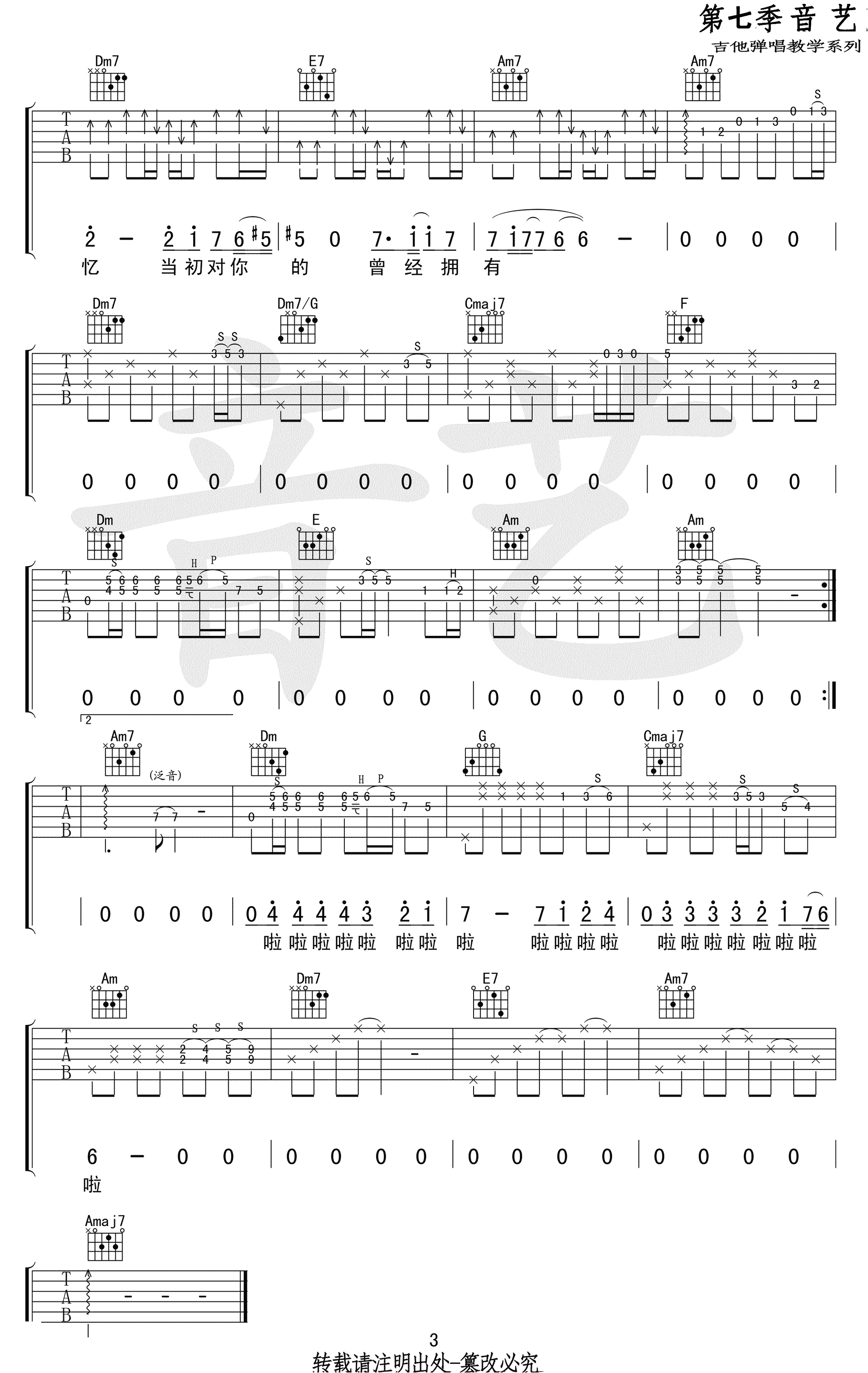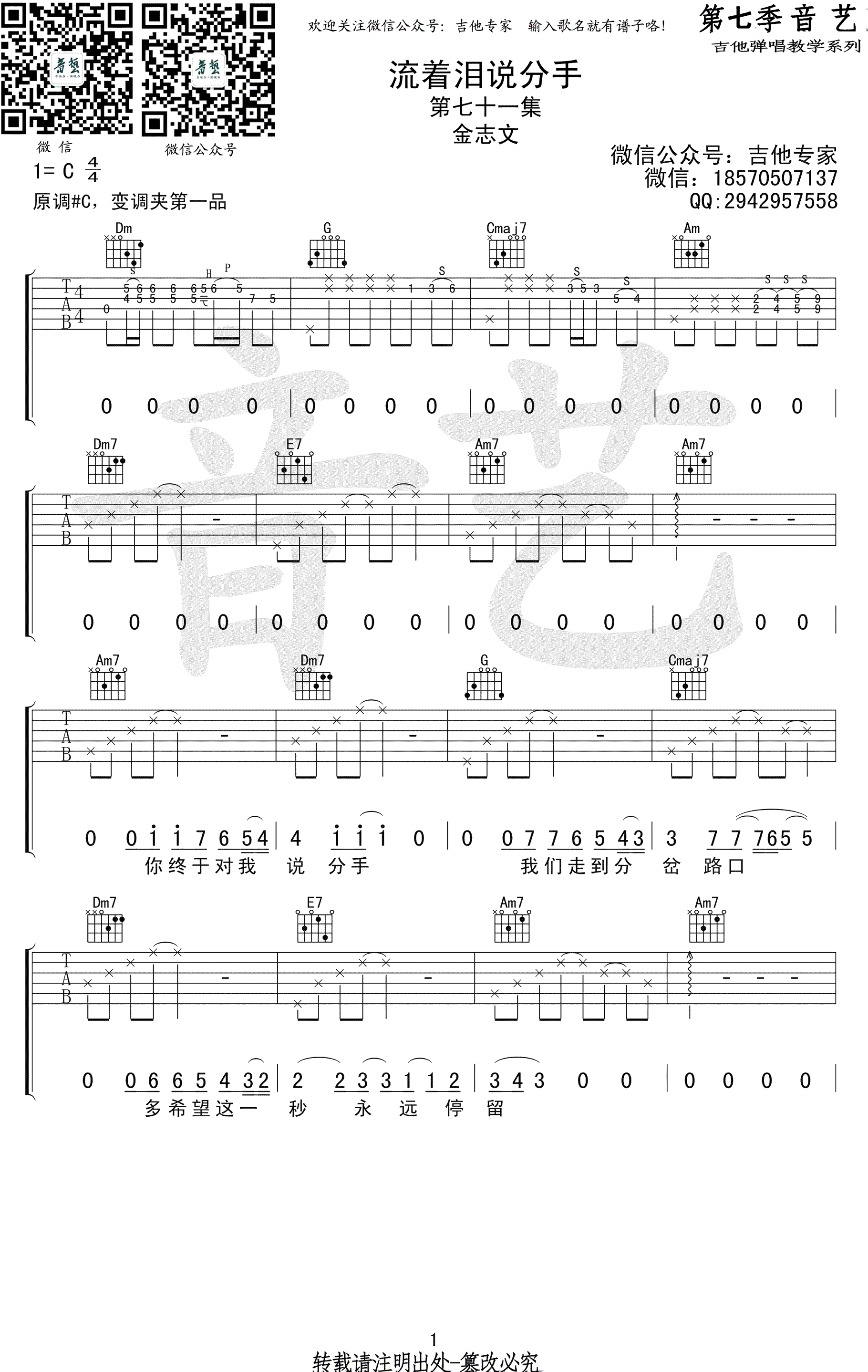 曲谱介绍: 《流着泪说分手》吉他谱,金志文演唱,C调指法,变调夹夹一品,流着泪分手六线谱,高清弹唱图片谱,感谢艺音出品,91吉他谱网站上传分享。 摇滚猫老师编配说明:金志文音乐鬼才,编曲水平一流,做谱子的时候都不好意思乱改!最近很喜欢这首歌曲,就做了一个自己习惯弹奏的版本,其实网上之前就有很完美的吉他谱了,抄袭比较多啊,怪不好意思的,大家弹琴的时候右手的节奏 型可以随便改!单身狗们千万不要错过啊!