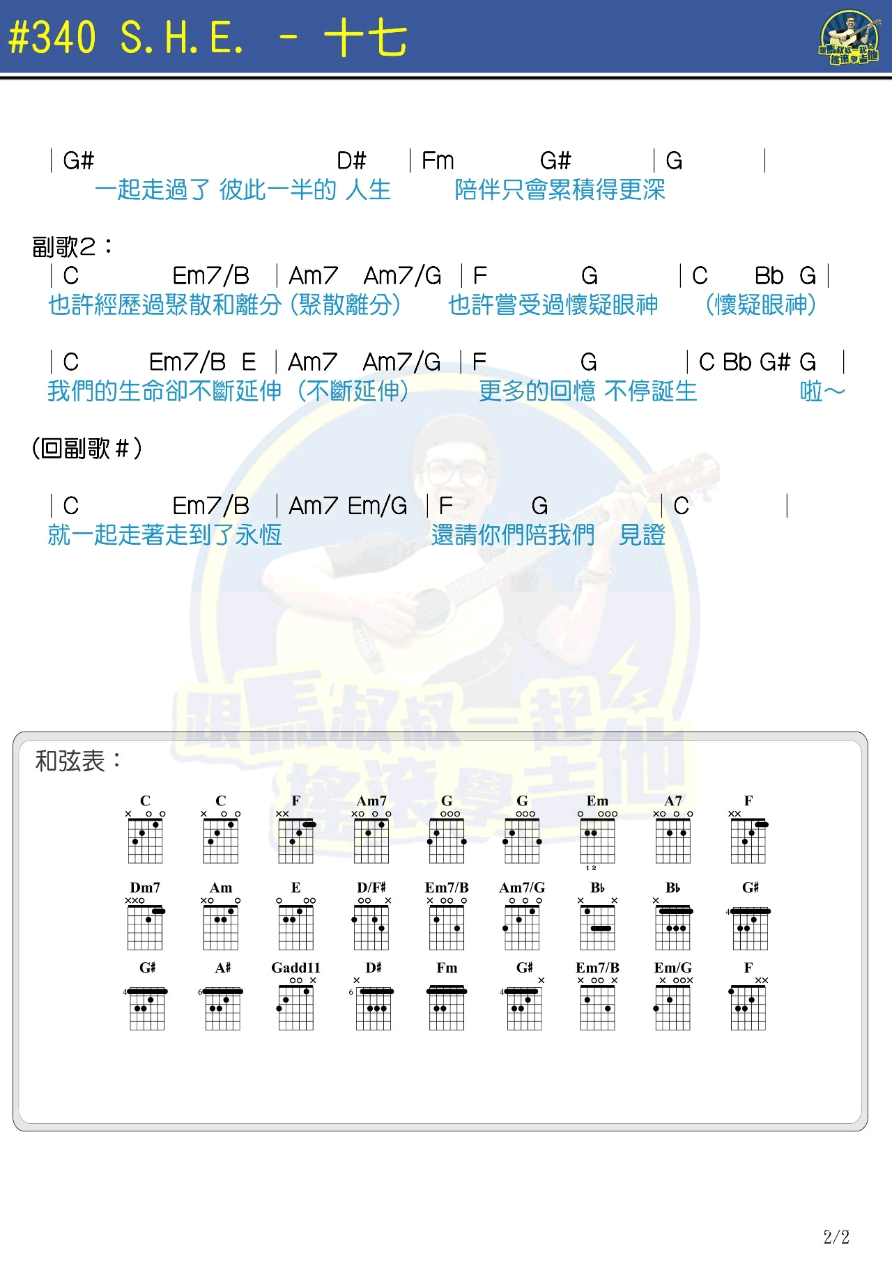 曲谱介绍: SHE《十七》吉他谱,和弦图片谱,感谢马叔叔吉他教室出品,随谱附上吉他弹唱教学演示视频。这是SHE出道十七年的纪念单曲。是一路成长光阴的纪念和心声。由吴青峰词曲创作,朴实中带着深厚的情感,娓娓述说第一女团SHE和歌迷这17年相伴的青春记忆。