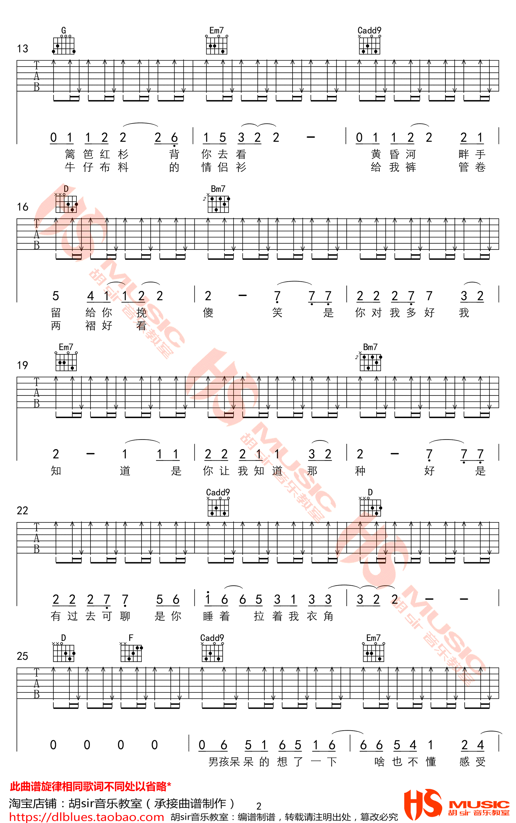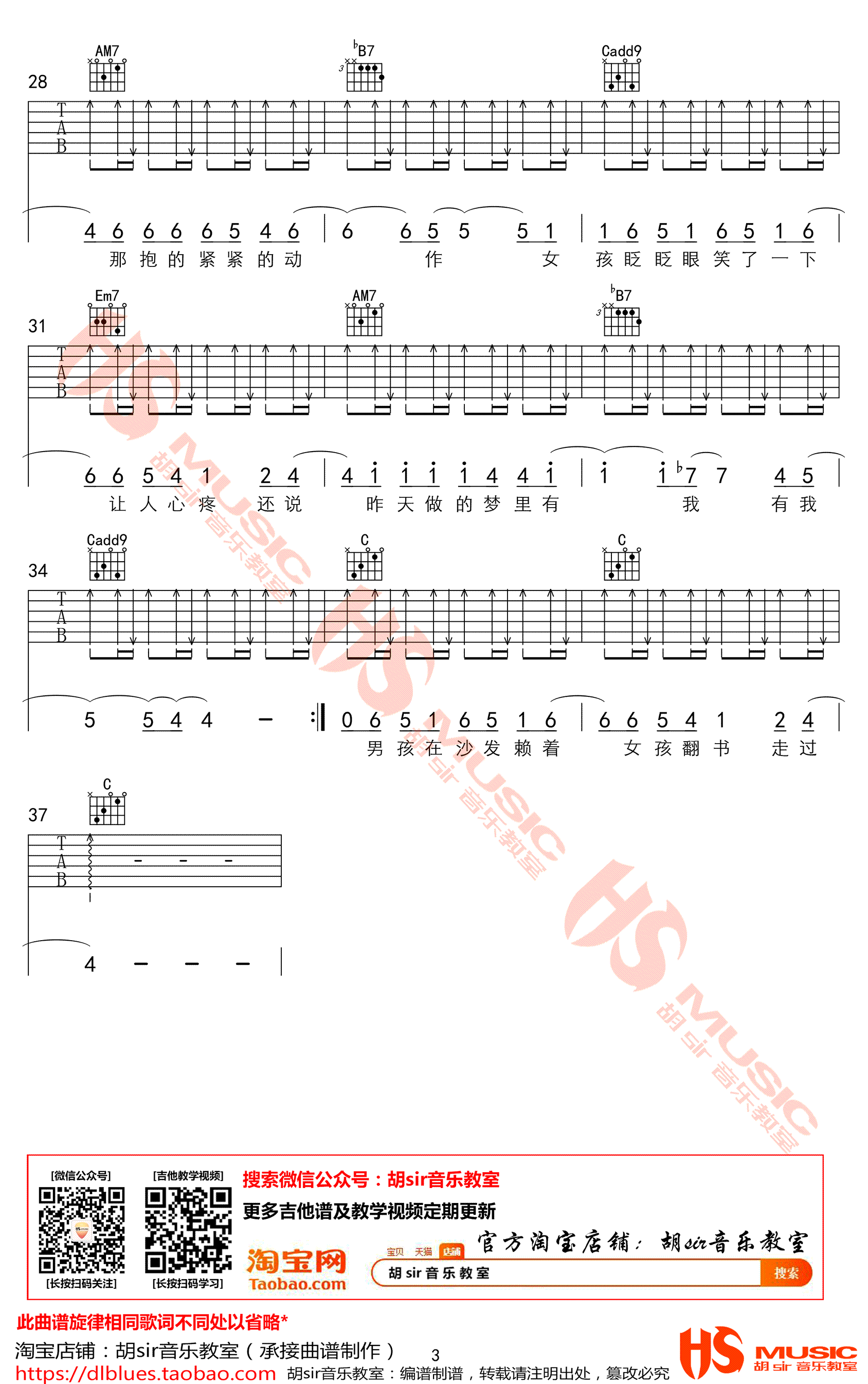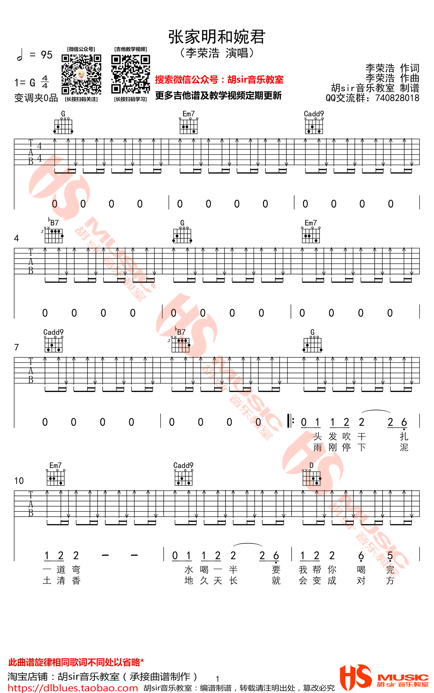 曲谱介绍: 李荣浩《张家明和婉君》吉他谱,G调指法编配,李荣浩一首让人怦然心动的浪漫小情歌,张家明和婉君六线谱,三张高清图片谱,胡sir音乐教室出品,91吉他谱网站上传推荐。 这首歌是李荣浩出道五周年单曲,歌曲中轻快的旋律,也是之前鲜有的风格,在轻快的音乐中仿佛能感受到张家明和婉君两小无猜的互动。