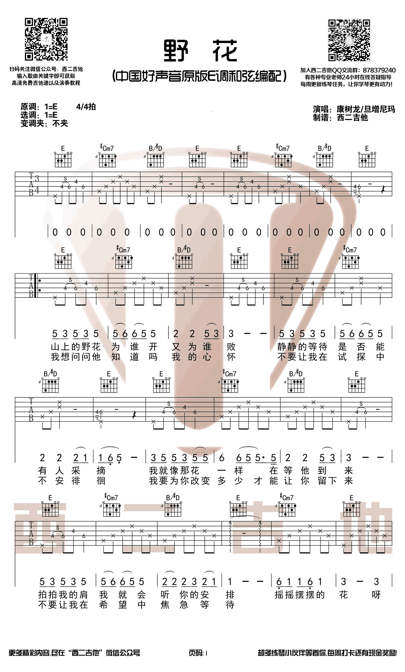 曲谱介绍: 野花吉他谱,《中国好声音》康树龙/旦增尼玛演唱,柔美搭悲情超好听,野花吉他弹唱谱,E调和弦原版编配,不需要变调夹,三张图片六线谱,西二吉他出品。 田震的一首经典老歌,《2018中国好声音》第六期,李健组选手康树龙和旦增尼玛合唱了这首歌曲,一个深沉沧桑,一个柔美空灵,两个不同的风格赋予这首经典不一样的味道。