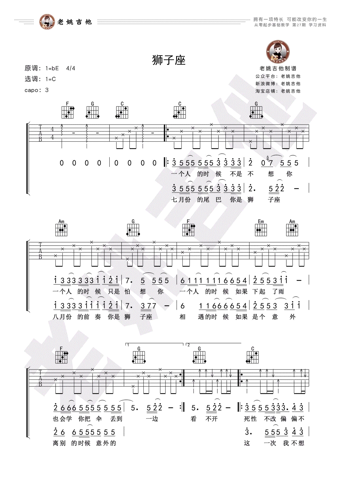 曲谱介绍: 狮子座吉他谱,曾轶可的一首代表歌曲,超级女声时期的成名曲,狮子座六线谱,原调降E,C调指法编配,CAPO夹三品,高清图片谱,感谢老姚吉他出品,随谱送上配套吉他弹唱教学视频,本期从零起步基础教学课程,配合歌曲《狮子座》讲解手指扫弦,把节奏画出来内容,琴友们参照老师的示范教学认真练习。 老姚吉他《狮子座》弹唱演示及视频教学