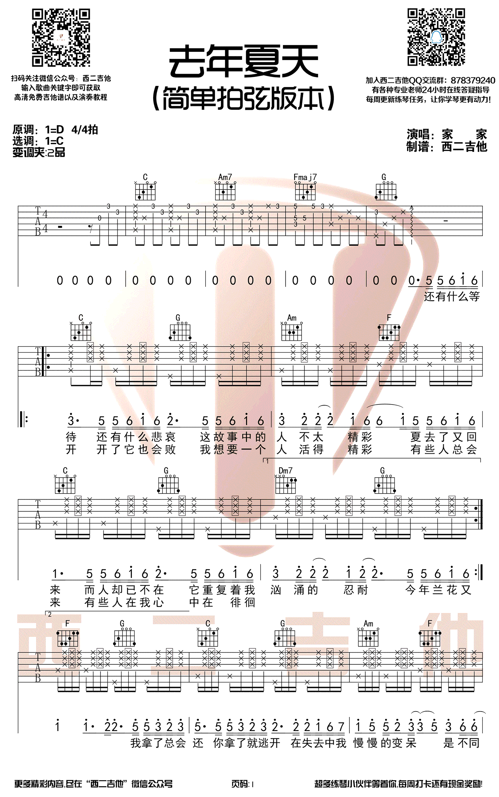 曲谱介绍: 去年夏天吉他谱,家家演唱,人气主播王大毛的演绎翻唱,让这首《去年夏天》成为网络平台的热门歌曲。去年夏天六线谱,原调D,变调夹夹第二品,选用C调指法,简单拍弦版本,高清弹唱图片谱,由西二吉他编配出品。 很有节奏感的歌曲,唱出洒脱阳光的心态。我们年少时的爱情,总会有一个人的愿意,一个人的喜欢,爱情故事中的你我,爱你是我,就够了,哪怕去年夏天不再回来。