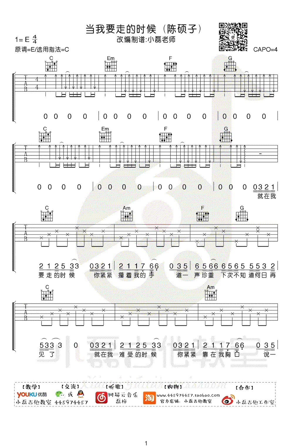 曲谱介绍: 陈硕子《当我要走的时候》吉他谱,E调原调,选用C调指法,CAPO夹四品,陈硕子的一首热门民谣创作,当我要走的时候六线谱,小磊吉他编配出品,91吉他谱上传分享。讲解说明:这是一首非常初级的扫弦歌曲(大量用到了扫弦),整曲的难度偏低!老师制作的这个乐谱只有主歌与副歌的区别,A段主歌我用到的分解,副歌与整个B段都是用的扫弦,且节奏型与前奏相同,所以在吉他部分没什么难度可言,学会一个小节,整曲都能弹下来了!左手和弦部分也都是C调非常常见的和弦!适合初级水平的同学学习一下!难度:4级 吉他弹唱演示及教学视频