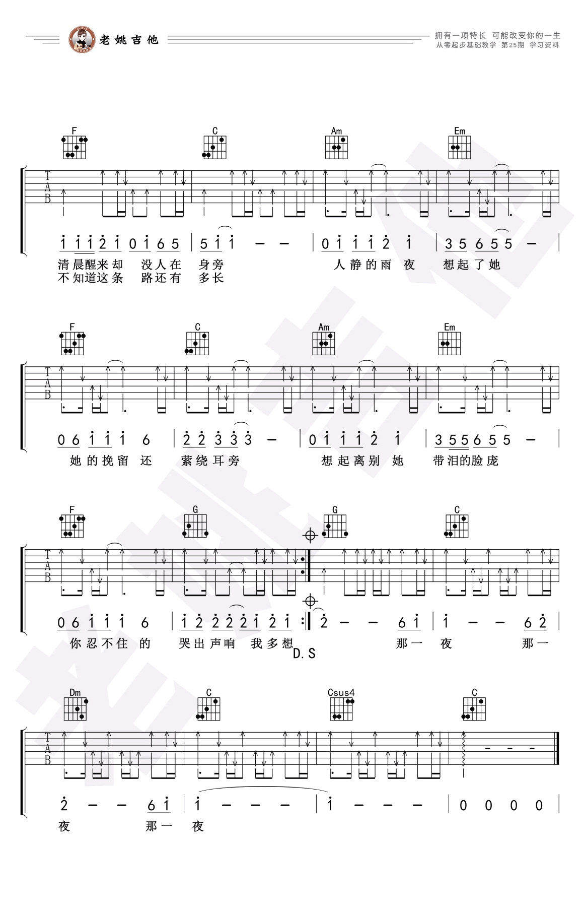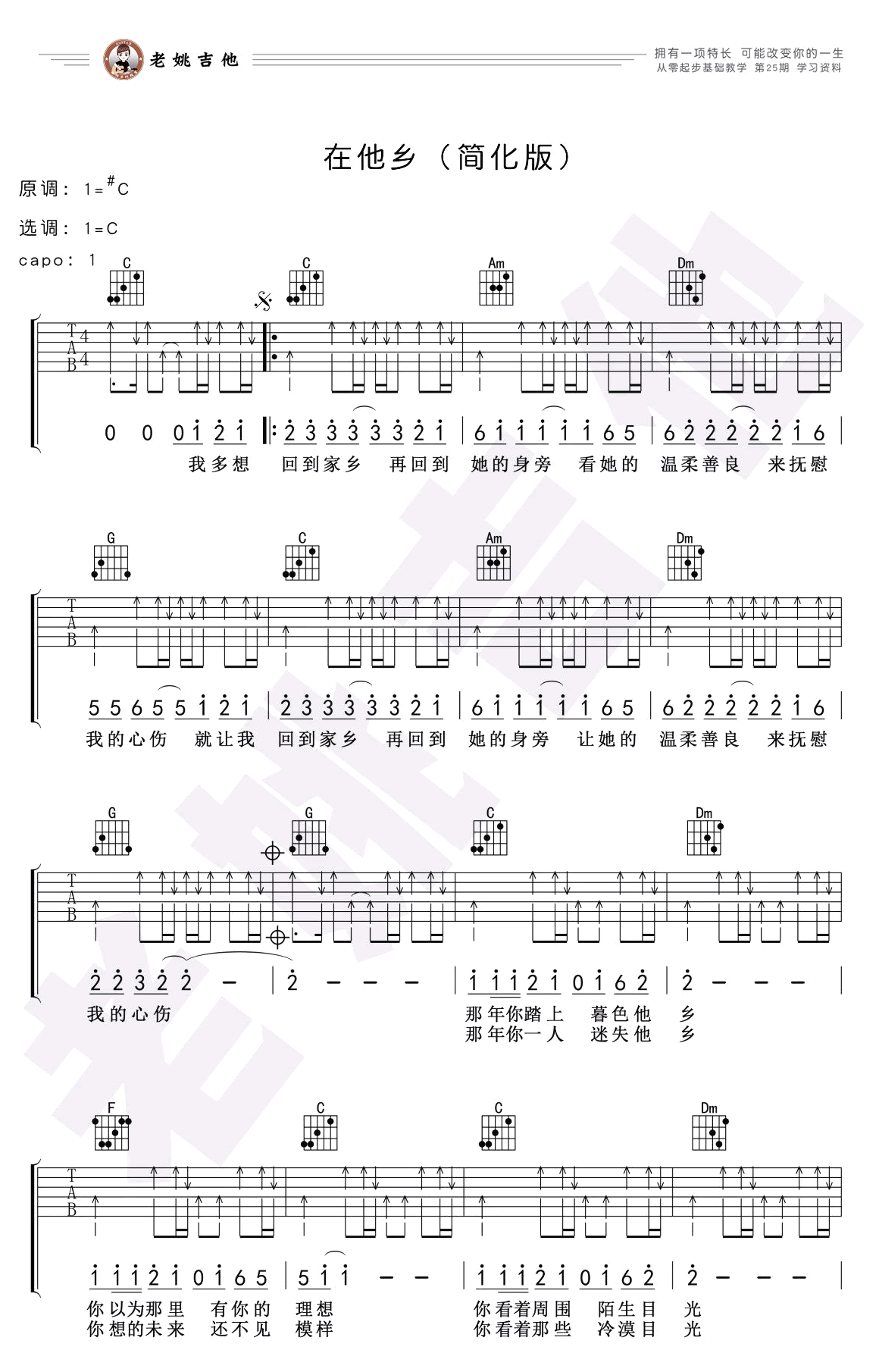 曲谱介绍: 水木年华《在他乡》吉他谱,简化版编配,原调#C,选调C,Capo夹一品。一首经典的民谣弹唱歌曲,在他乡六线谱,两张高清图片谱,感谢91吉他谱网站合作伙伴老姚吉他出品,本期从零起步基础教学,配合歌曲,学习拨片扫弦复杂节奏内容。跟着节拍器,琴友们参照老师的讲解示范练习起来。 吉他弹唱演示及教学视频