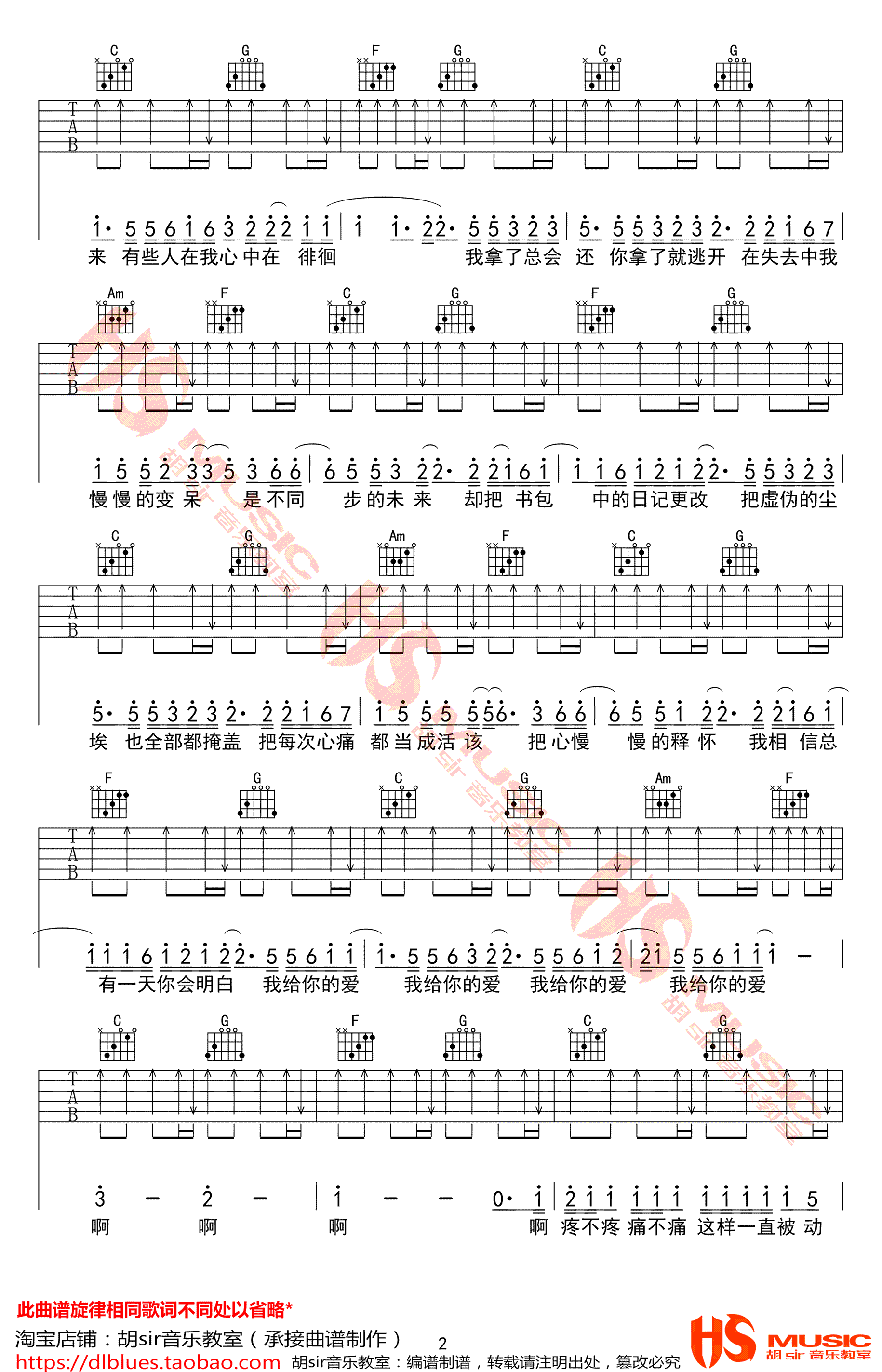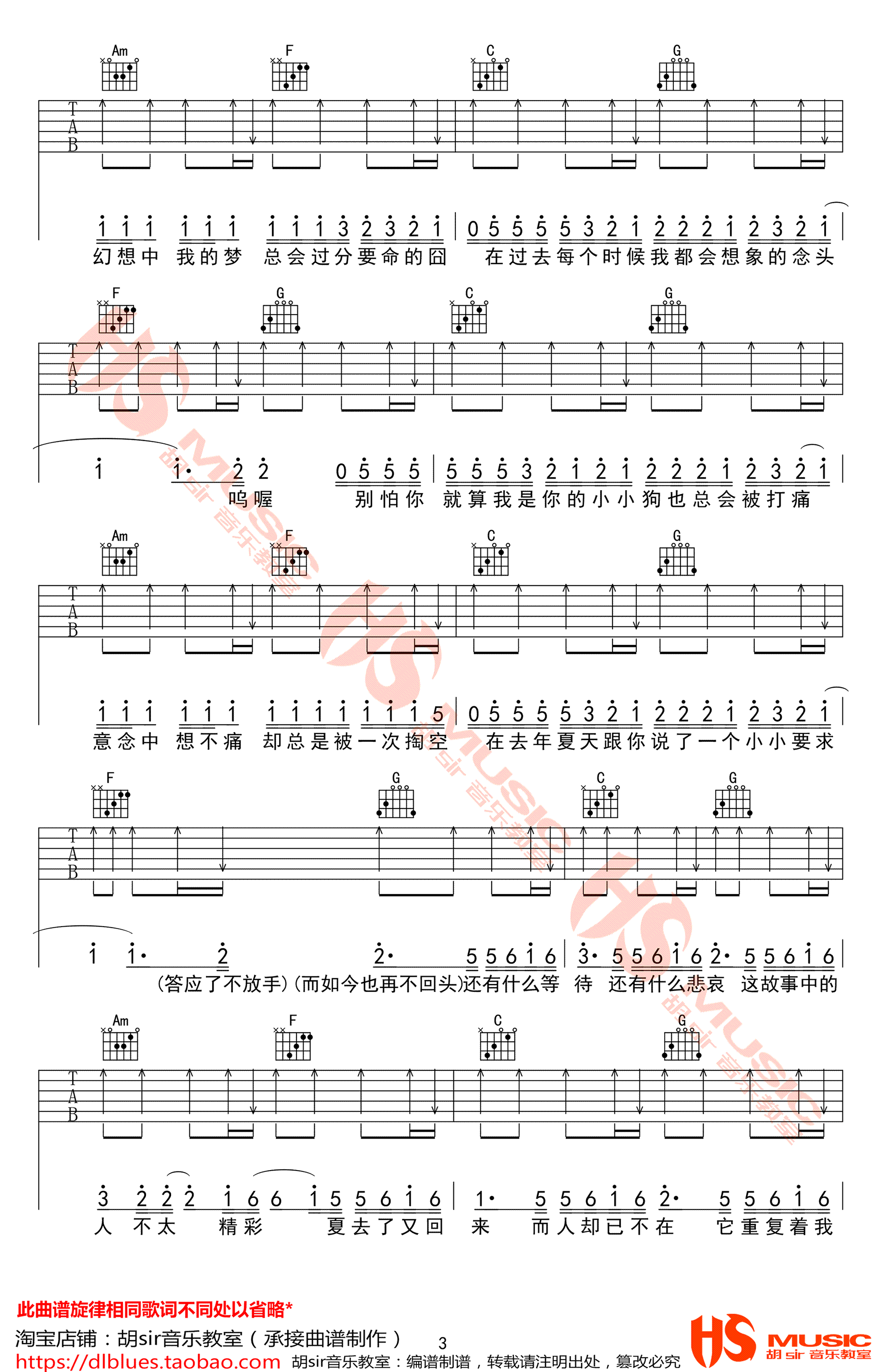 曲谱介绍: 王大毛《去年夏天》吉他谱,D调弹唱谱,变调夹夹二品,去年夏天六线谱,完整版共五张图片谱例,胡sir音乐教室出品,91吉他谱网站上传分享。