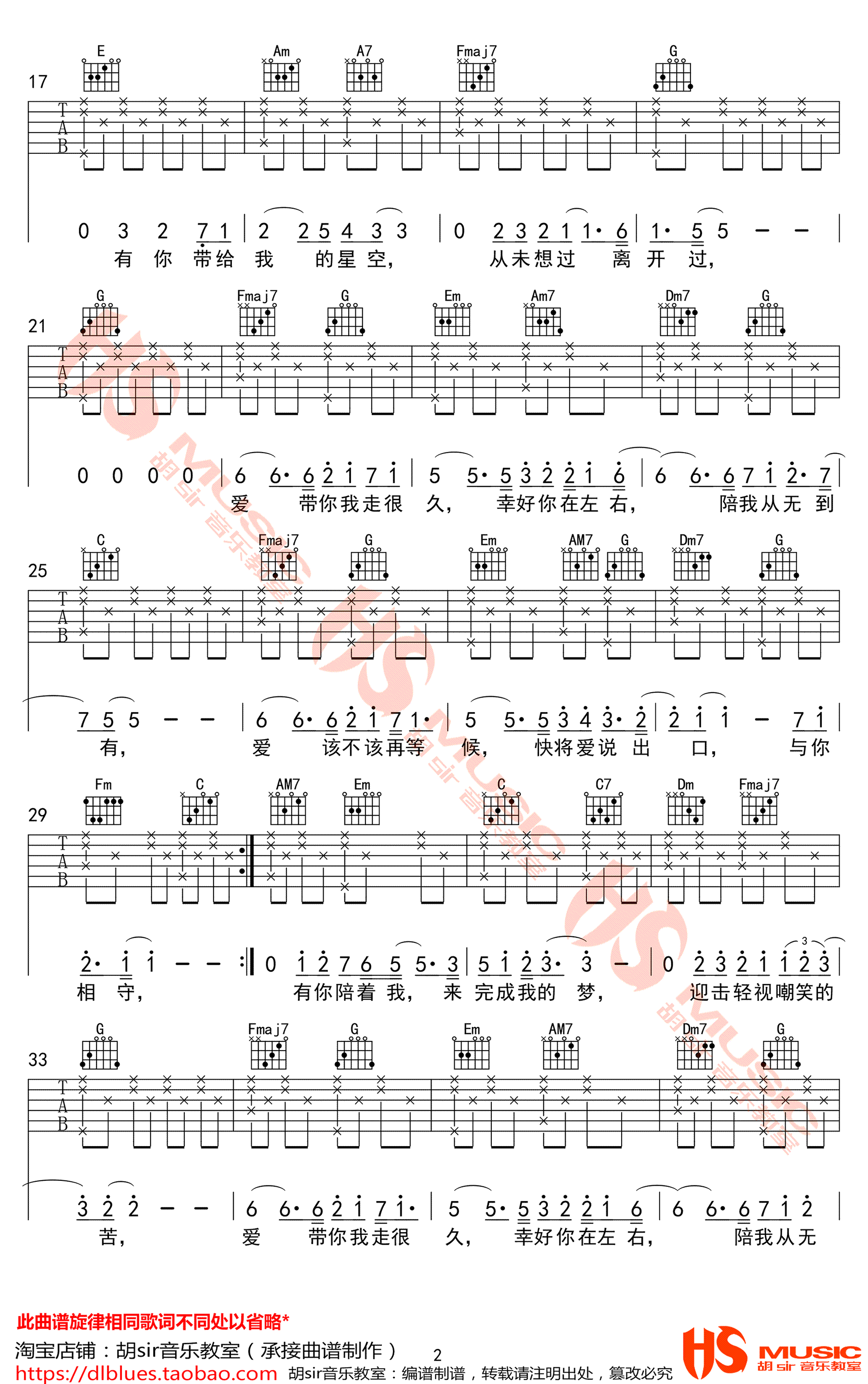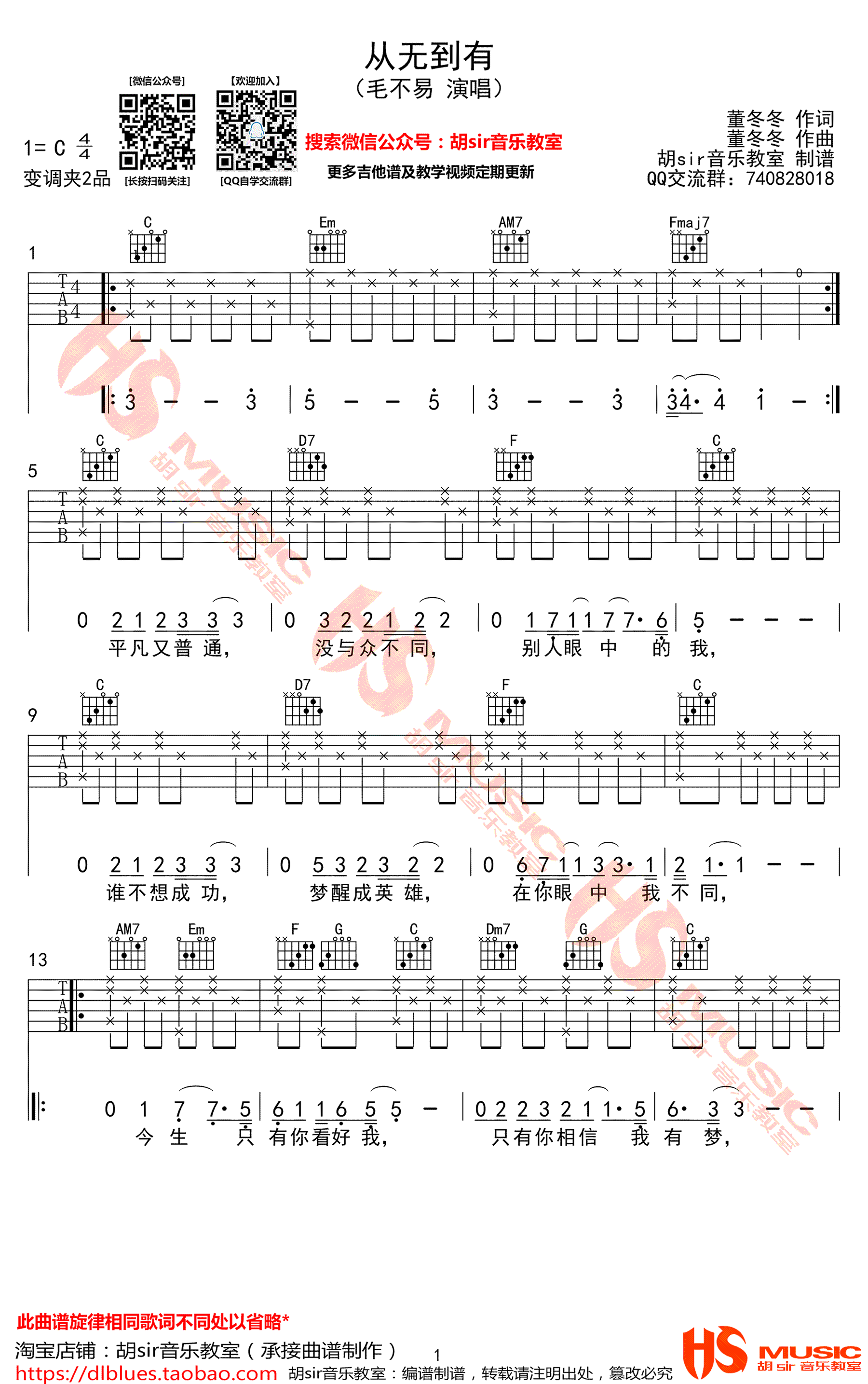曲谱介绍: 从无到有吉他谱,毛不易电视剧《创业时代》片尾曲,从无到有六线谱,C调弹唱指法,变调夹夹第二品,三张图片谱高清版,胡sir音乐教室出品,91吉他谱网站推荐分享。 一首温暖励志的歌曲,朗朗上口的悠扬旋律,沉静安稳的歌声,诉说创业路上的艰辛和坚持,爱人的支持守护,给为梦想奋斗的人无限前行的勇气。