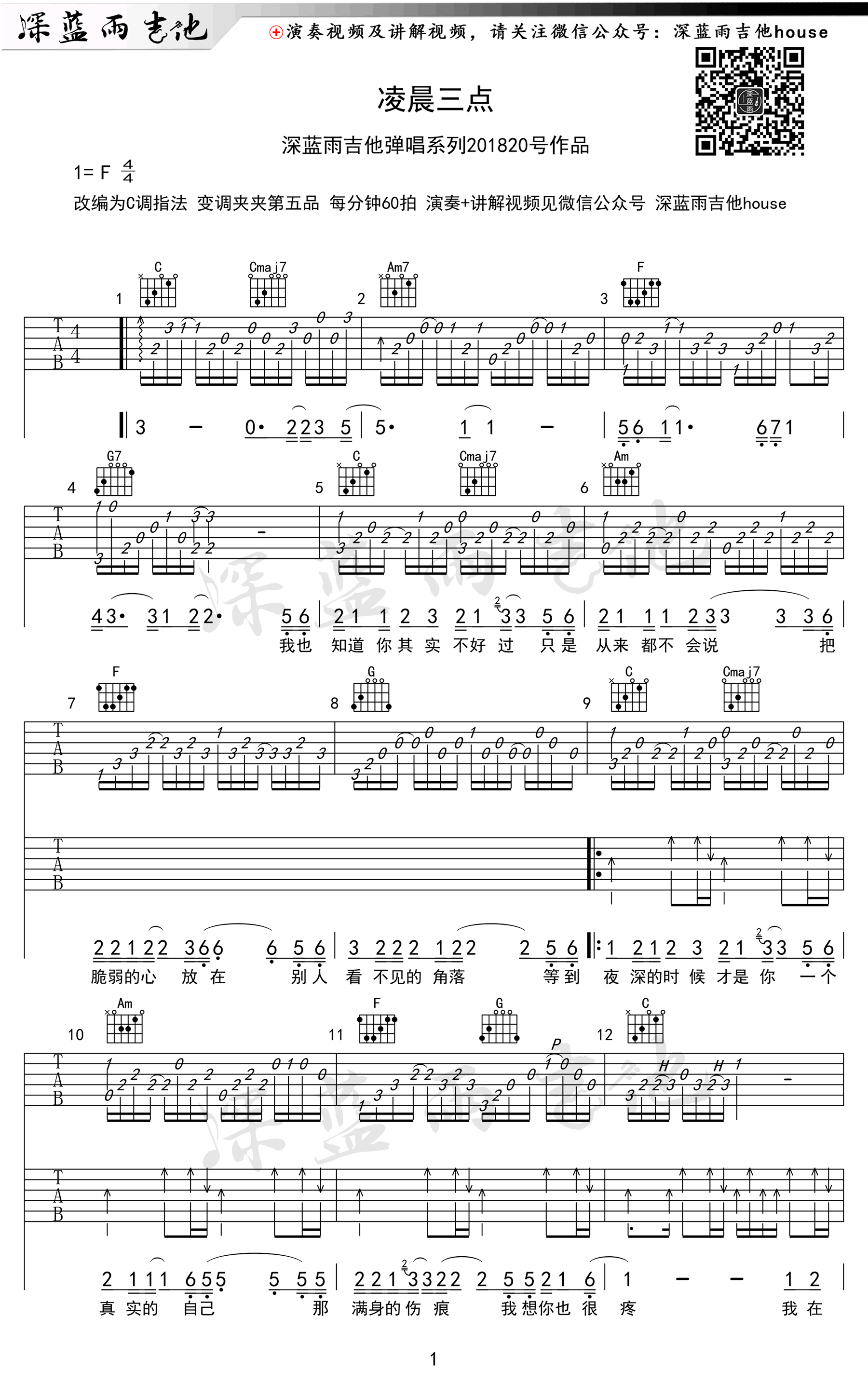 曲谱介绍: 凌晨三点吉他谱,陈硕子的一首热门民谣歌曲,凌晨三点六线谱,C调指法编配,变调夹五品为原调音高,高清弹唱图片谱三张谱例,由深蓝雨吉他出品,91吉他谱推荐分享。随谱附上配套吉他弹唱教学,琴友们跟随老师的示范讲解学习。