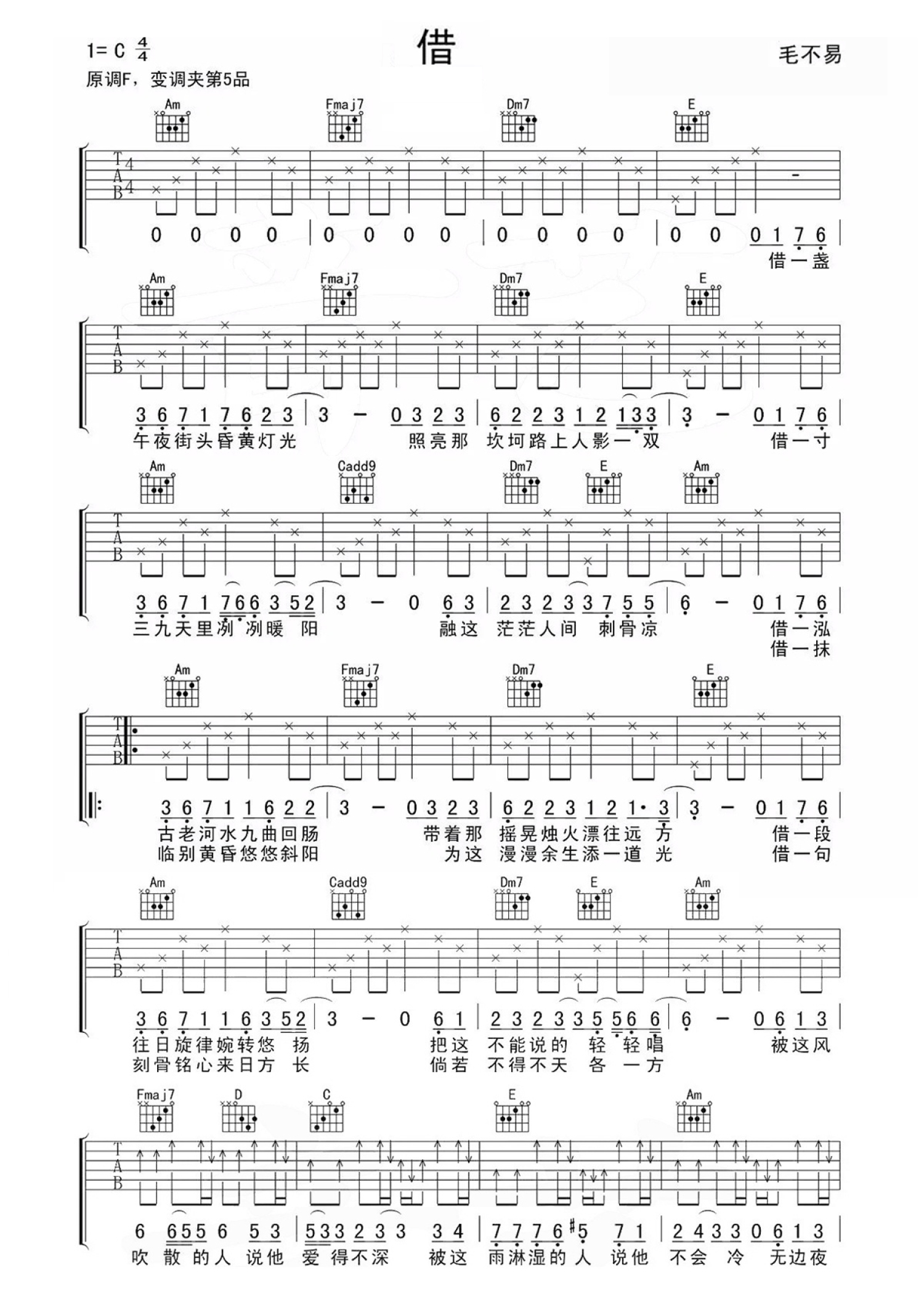 曲谱介绍: 原调F,变调夹5品。C调版本编配,更易上手适合初学者。明日之子第11期毛不易的借,听了令人有久久无法轻易消逝的伤怀和感动。喜欢这首歌曲的琴友们练习起来吧。