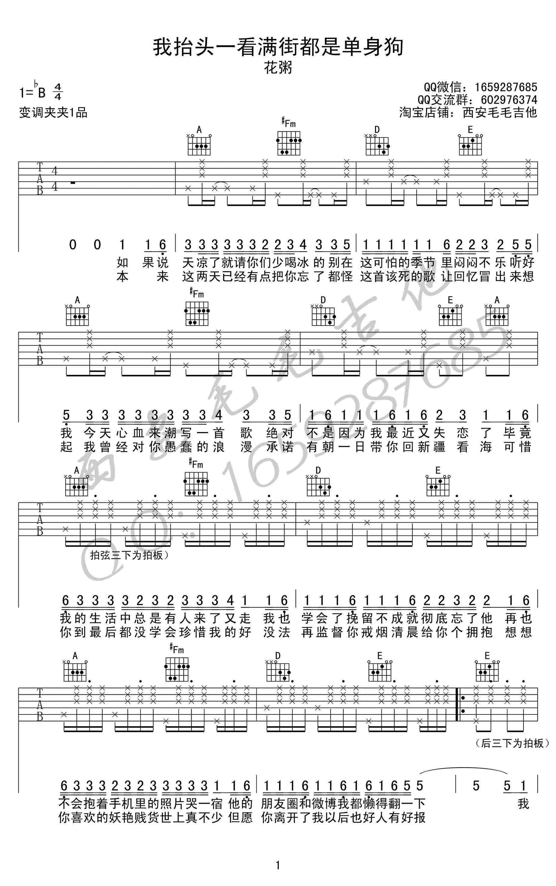 曲谱介绍: 我抬头一看满街都是单身的狗吉他谱,花粥的一首超魔性的新歌,A调指法原版编配,变调夹夹第一品。我抬头一看满街都是单身的狗吉他弹唱谱,高清图片六线谱,毛毛吉他出品。