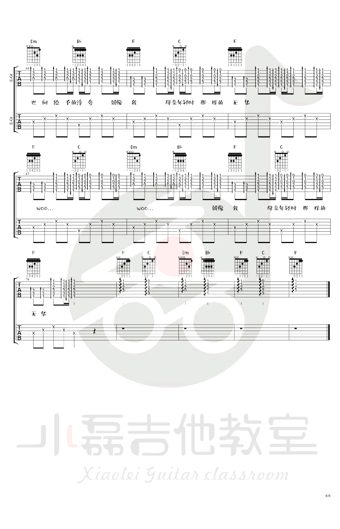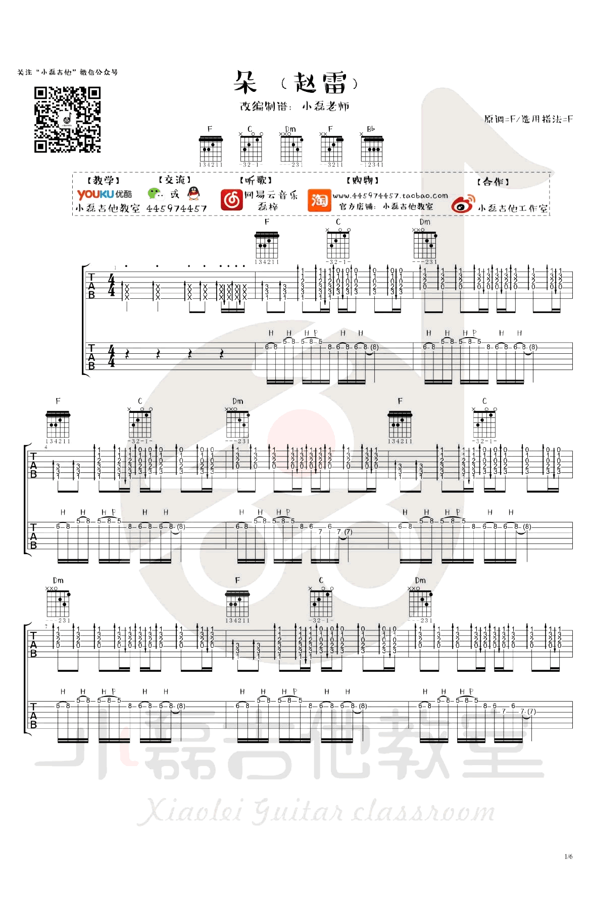 曲谱介绍: 赵雷《朵》吉他谱,F调指法编配,双吉他编配版本,朵六线谱,完整版六张高清图片谱,小磊老师编配,同时带来吉他弹唱教学视频。这首歌原版是由乐队演奏完成,如果只使用一把吉他,就会显得单调,这里老师就改编成为双吉他版本,可以和同学或琴友一起合作。当然如果找不到人合作只弹吉他1也可以,左手和弦部分不难,右手建议使用拨片,注意间奏的solo的练习。 《朵》吉他弹唱示范+教学视频